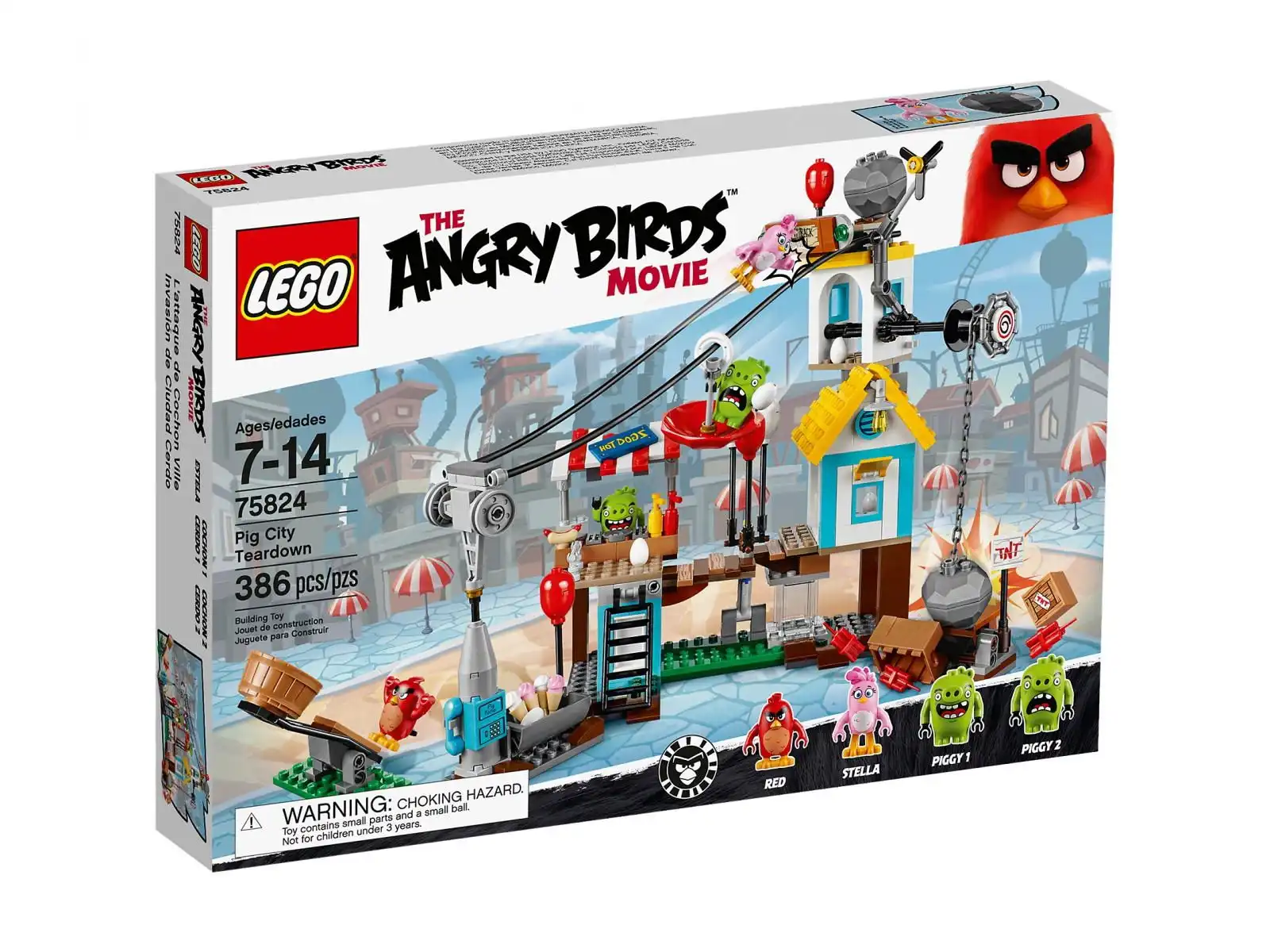 Miasto jest pełne świnek, które dwoją się i troją, żeby tylko ukryć jajka. Wystrzel ptaki z katapulty! Spróbuj przewrócić budynki, trafiając w 4 zapadające się strefy celów. Ten zestaw bazuje na filmie The Angry BirdsTM i dostarczy Ci mnóstwa szalonej zabawy. Znajdziesz w nim domek, most, stoisko z hot dogami, świnkę zjeżdżającą na linie i funkcję wybuchu dynamitu. Zawiera 4 figurki.