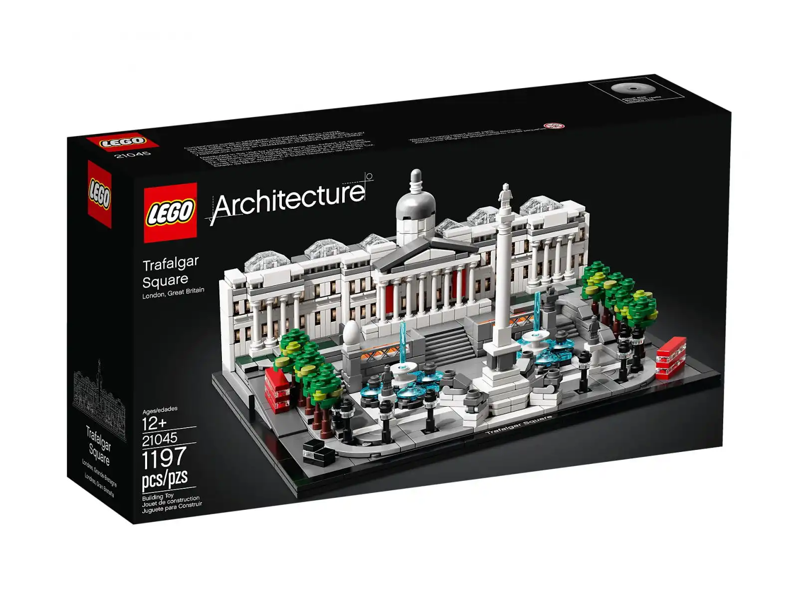 Uchwyć atmosferę zabytkowego londyńskiego placu, budując zestaw LEGO® Architecture 21045 Trafalgar Square. Plac ten został nazwany na cześć Lorda Horatio Nelsona, który w 1805 r. odniósł zwycięstwo w bitwie morskiej z Napoleonem. Obecnie plac jest popularną atrakcją turystyczną, a także częstym miejscem spotkań politycznych i innych wydarzeń. Ta szczegółowa interpretacja z klocków LEGO przedstawia budynek National Gallery z kopułą i fasadą kolumnową, kolumnę Nelsona z czterema lwami po bokach, słynne fontanny i cztery cokoły z rzeźbami. Sekcje z tyłu National Gallery można zdjąć, by zajrzeć do szczegółowego wnętrza, w którym znajduje się zbudowana z klocków rzeźba i obrazy. Całości dopełniają drzewa na obrzeżu modelu, misterne latarnie, dwa londyńskie autobusy, dwie czarne taksówki oraz pokryta płytkami podstawka przedstawiająca plac i otaczające go ulice. Ten kolekcjonerski model do zbudowania zawiera dekoracyjną płytkę z nazwą i świetnie sprawdzi się jako rozpoznawalny element wystroju domu lub biura. Złożenie go to fascynujące wyzwanie, które zapewni dużo satysfakcji każdemu miłośnikowi architektury, podróży, historii i projektowania.