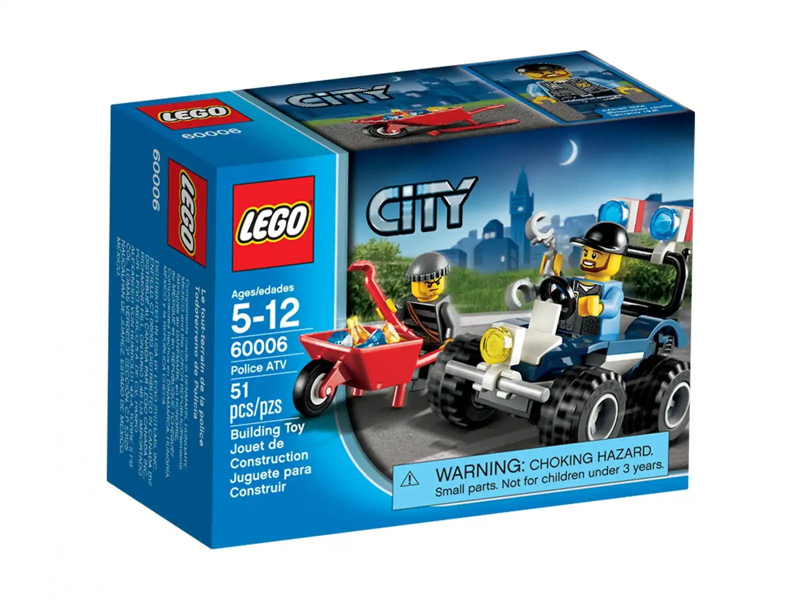 Zestaw LEGO City - Quad policyjny trafił do sprzedaży w 2013 roku. Numer katalogowy tego zestawu to 60006. Zawiera 51 klocków LEGO. W modelu znajdziesz też 2 minifigurki. Nazwa zestawu w języku angielskim LEGO City - Police ATV. Grupa wiekowa tego produktu to 5+