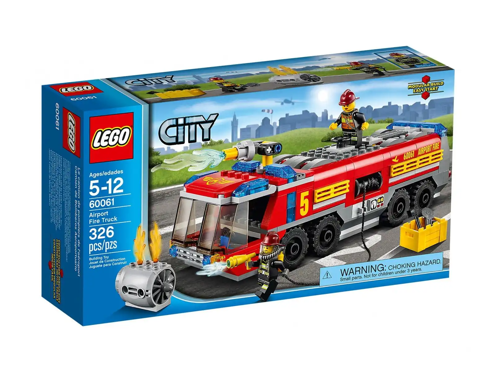Zestaw zawiera: 2 minifigurki strażaków z wyborem akcesoriów. Lotniskowy wóz strażacki i płonący silnik odrzutowy.