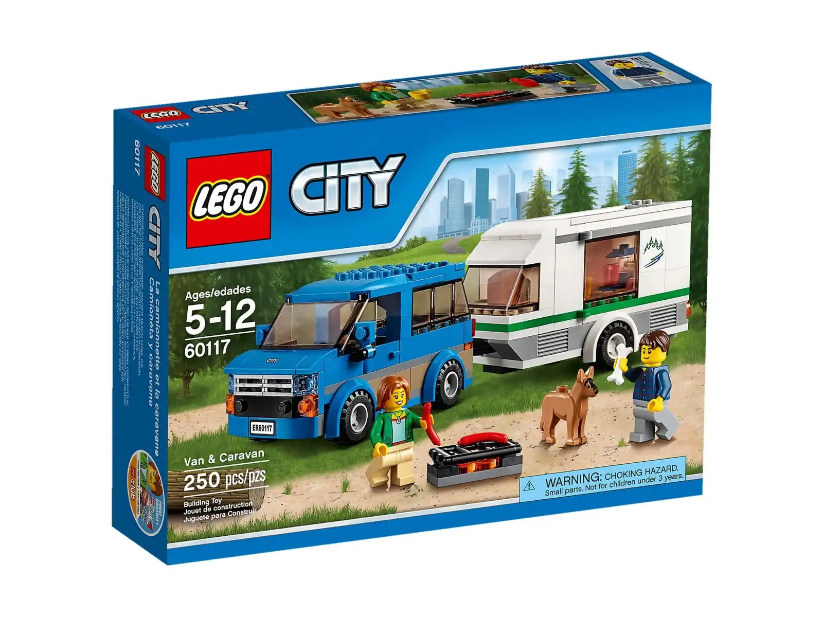 Zestawy z serii LEGO City cieszą się ogromnym powodzeniem. Prezentowany produkt to autko typu VAN wraz z przyczepą kempingową. Aby zabawa była jeszcze lepsza, producent dołączył 3 mini figurki: kobietę, mężczyznę i psa. Auto w modnym, niebieskim kolorze, z otwieranymi drzwiami, doskonale się prezentuje wśród zieleni lasu, bądź polany. Przyczepa kempingowa nie dość, że wygląda bardzo nowocześnie, to jest również niezwykle praktyczna. Producent zapewnił sprytny dostęp do jej wnętrza. Wystarczy jednym ruchem ręki otworzyć jedną ściankę. Została ona przymocowana na zawiasie. Niby tak proste rozwiązanie, a jakże ułatwiające zabawę. W środku znajduje się kuchenka oraz łóżko. Do zestawu dołączone zostały również takie akcesoria, jak: grill, ekspres do kawy, 2 kiełbaski, czy kość dla pieska. Samochód ma wymiary: 12 x 6 x 6 cm, a przyczepa: 13 x 6 x 5 cm.