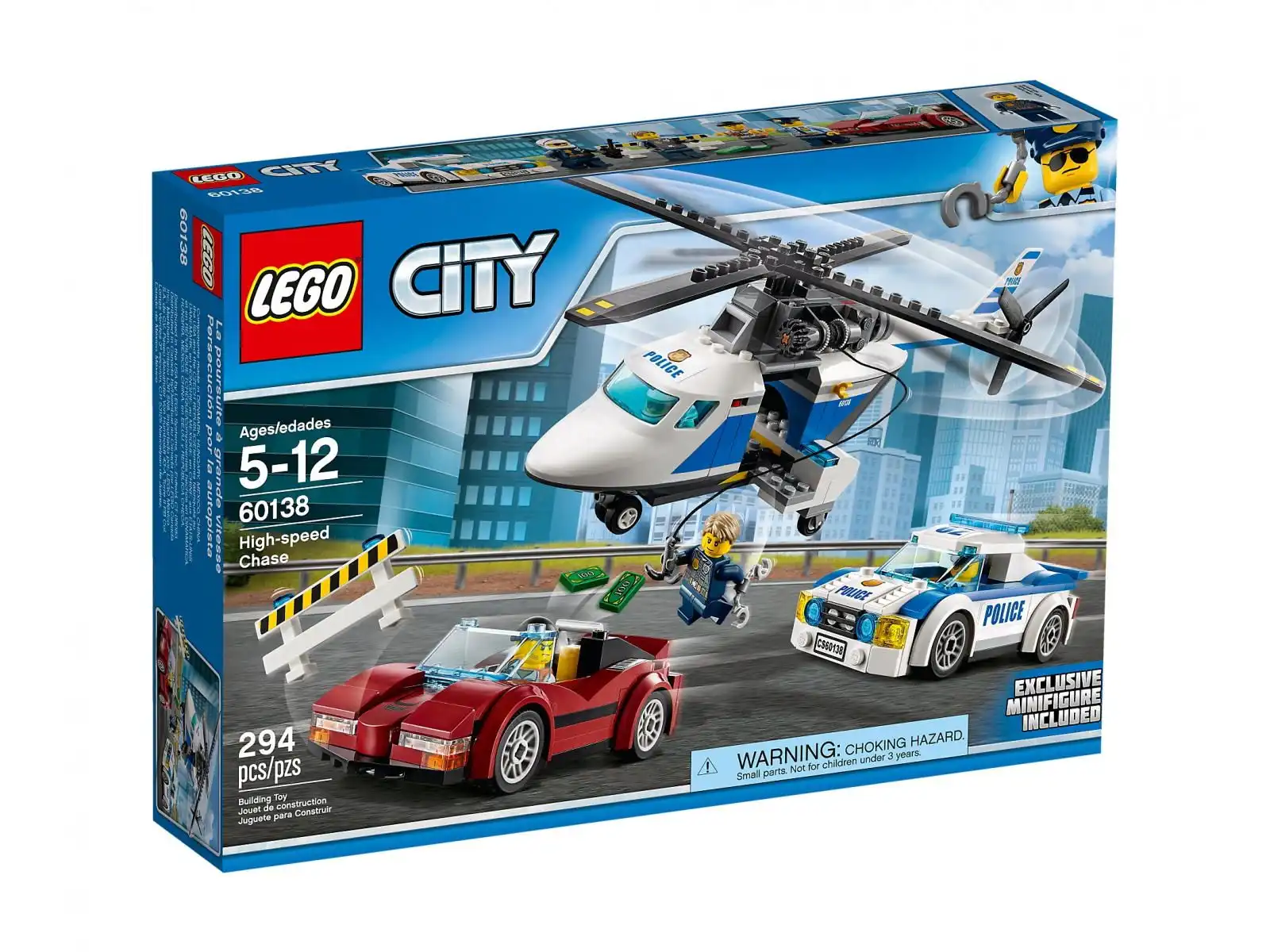 Czerwony alarm! Złodziejaszek zwędził pieniądze i złoto, a teraz ucieka z miasta ukradzionym samochodem sportowym! Wskocz do policyjnego radiowozu pościgowego i ruszaj za nim! Nie dasz rady go dogonić? Wezwij na pomoc helikopter policyjny. Opuść Chase’a McCaina na linie wyciągarki i pomóż mu aresztować przestępcę. Dla policjantów z LEGO® City zapowiada się dzień pełen emocji!