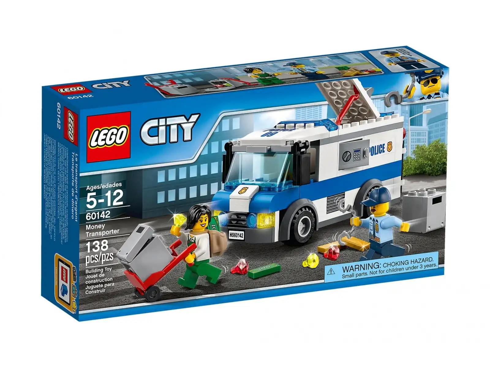 Policja LEGO City ma jak zwykle pełne ręce roboty. Pomóż policjantowi złapać złodziejaszka, który próbuje uciec z sejfami! W zestawie znajdziesz furgonetkę do przewozu pieniędzy z otwieraną klapą w dachu, zamkiem i otwieranymi drzwiami z tyłu, a także dwa sejfy, ręczny wózek, łom i inne akcesoria. Zestaw zawiera dwie minifigurki.