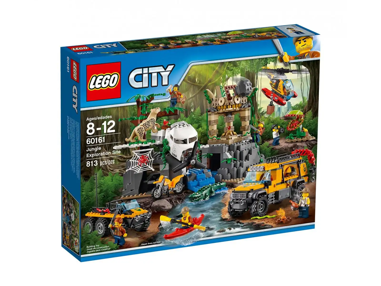 Zobacz, co czeka na Ciebie na miejscu badań w dżungli: wrak samolotu z otwieranym kokpitem, helikopter-amfibia z kokpitem na minifigurkę, obracanymi śmigłami i wyciągarką, wytrzymała terenówka obserwacyjna z miejscem na minifigurkę w kabinie, składanym ramieniem żurawia, miejscem obserwacyjnym i uchwytem na motocykl z tyłu, a także amfibia z miejscem na minifigurkę w kabinie, jaskinia i świątynia do zbudowania. Zestaw zawiera też siedem minifigurek oraz figurki lamparta, krokodyla, węża, żaby i dwóch pająków.