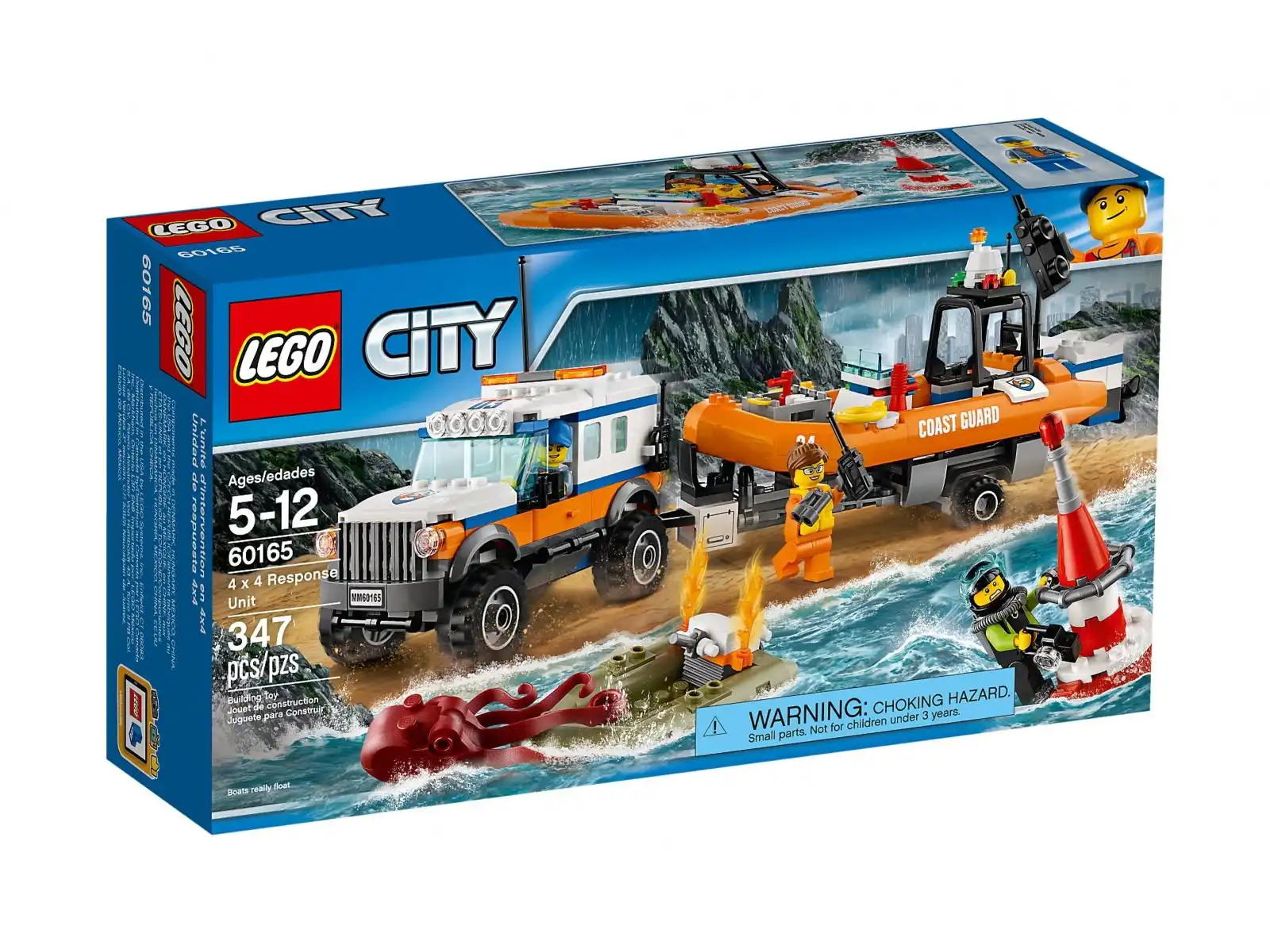 Dołącz do profesjonalnej ekipy straży przybrzeżnej LEGO® City i jej jednostki szybkiego reagowania z terenówką z miejscem na minifigurkę w otwieranej kabinie, otwieranym tylnym schowkiem na narzędzia i sprzęt oraz odczepianą przyczepą na łódź ratowniczą z miejscem na dwie minifigurki, opuszczanymi silnikami i obracającymi się wirnikami, antenami radiowymi, skrzynką na narzędzia i kołami ratunkowymi. W zestawie jest też ponton nurka ze sprzętem do nurkowania, silnikiem i płomieniami. Zestaw zawiera trzy minifigurki i figurkę ośmiornicy.