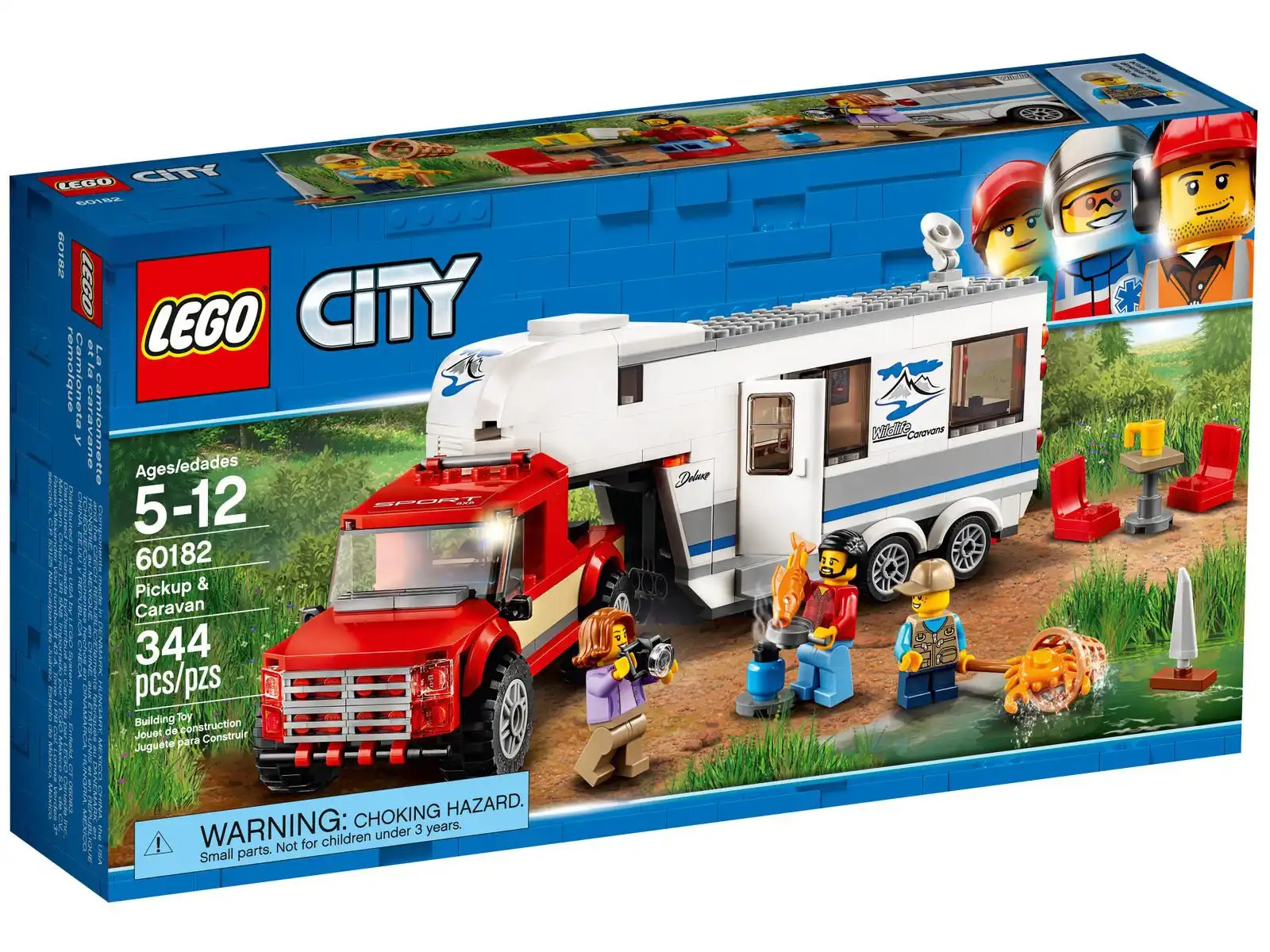 W zestawie znajdziesz przyczepę kempingową z otwieranym bokiem, drzwiami i fragmentem dachu z przodu, który można zdjąć, aby dostać się do sypialni. Przyczepa ma też demontowalne wyposażenie oraz osobną podporę, która pozwala jej stać samodzielnie. Pickup ma z kolei zdejmowany dach kabiny oraz platformę z zaczepem holowniczym. Ten ciekawy zestaw dla chłopców i dziewczynek zawiera 3 minifigurki i figurkę kraba.
