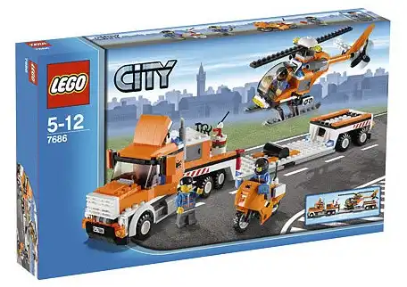 LEGO City 7686 Helicopter Transporter to zestaw klocków z serii Ruch Drogowy, przeznaczony dla dzieci w wieku 5 lat i powyżej. Zestaw składa się z 377 elementów, w tym helikoptera transportowego, motocykla, palety i figurki pilota. Klocki pochodzą od marki LEGO i posiadają certyfikat CE.