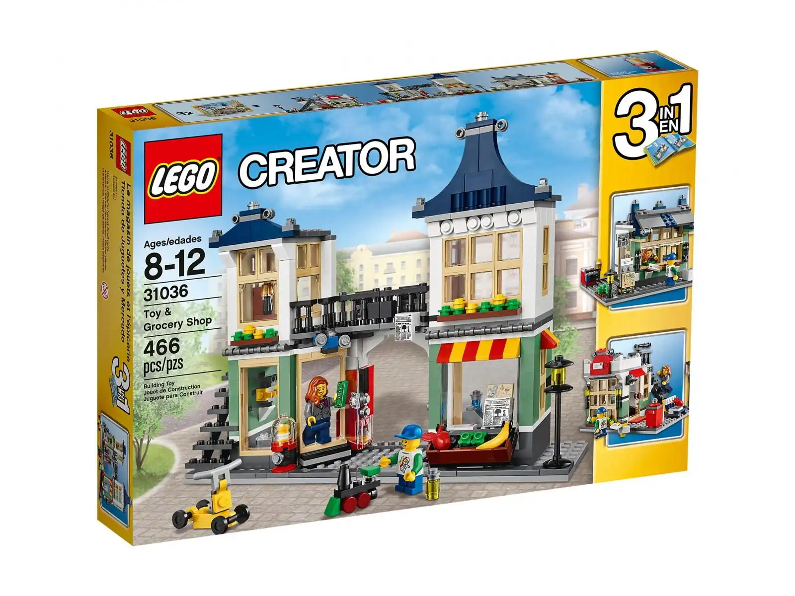 Na zewnątrz możesz kupić smaczne, czerwone jabłko lub jedną z kolorowych gum do żucia z pobliskiego automatu! Główną ulicę można rozbudować swoimi własnymi budowlami LEGO®! Z zestawu można zbudować także budynek poczty lub kiosk z prasą — możliwości godne prawdziwego modelu typu 3 w 1!