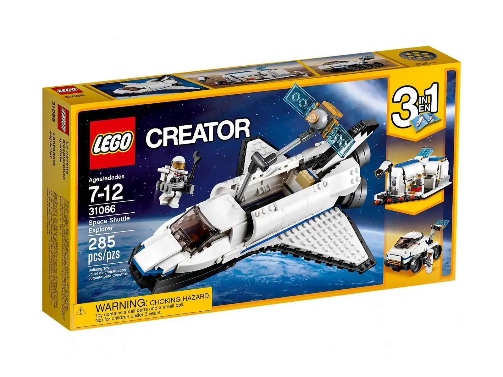W zestawie minifigurka astronauty z plecakiem odrzutowym.• Model składa się z białych, czarnych i szarych klocków, więc wygląda jak prawdziwy statek kosmiczny.• Załóż plecak odrzutowy i wyprowadź astronautę na niebezpieczny spacer kosmiczny.• Model typu 3 w 1: można go przebudować na stację księżycową ze szczegółowym wnętrzem, panelem sterowania i robotycznym ramieniem albo w kosmiczny łazik z otwartym kokpitem i wiertłem.• Badawczy statek kosmiczny ma ok. 9 cm wysokości, 26 cm długości i 19 cm szerokości.• Stacja księżycowa ma ok. 6 cm wysokości, 18 cm szerokości i 11 cm głębokości.• Łazik kosmiczny ma ok. 6 cm wysokości, 13 cm długości i 8 cm szerokości.