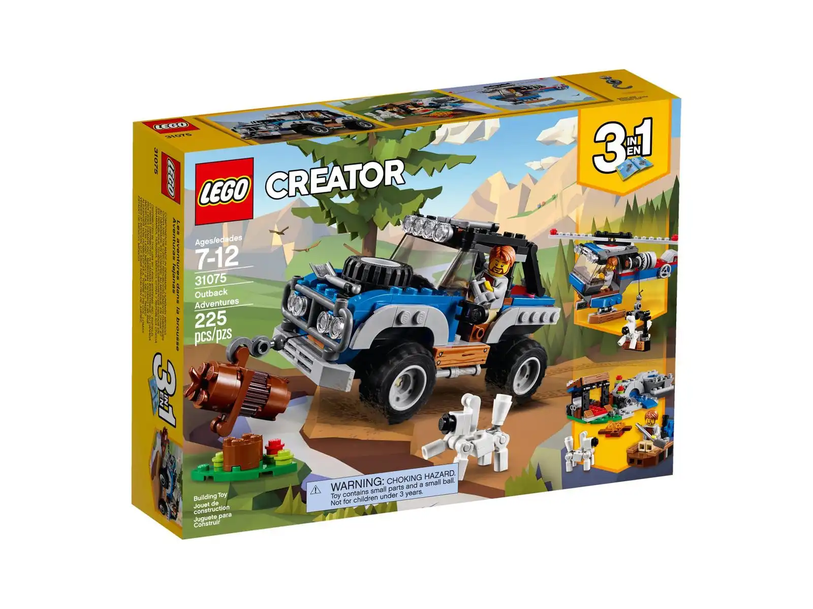- Przeżywaj kolejne przygody z tym modelem 3 w 1. Przebuduj terenówkę na obozowisko z szałasem, łódką i górskim strumieniem lub wykonaj brawurową misję ratowniczą w helikopterze z wyciągarką.