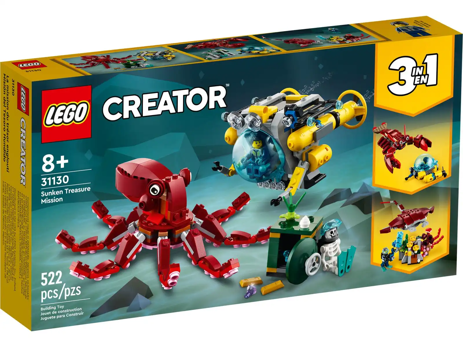 Dzięki niesamowitemu zestawowi LEGO® Creator 3 w 1 Wyprawa po zatopiony skarb (31130) dzieci w wieku od ośmiu lat mogą przeżywać ekscytujące podwodne przygody. Zestaw zawiera rewelacyjny batyskaf, wielką zabawkową ośmiornicę, dwie minifigurki oraz sejf ze sztabkami złota i klejnotami.