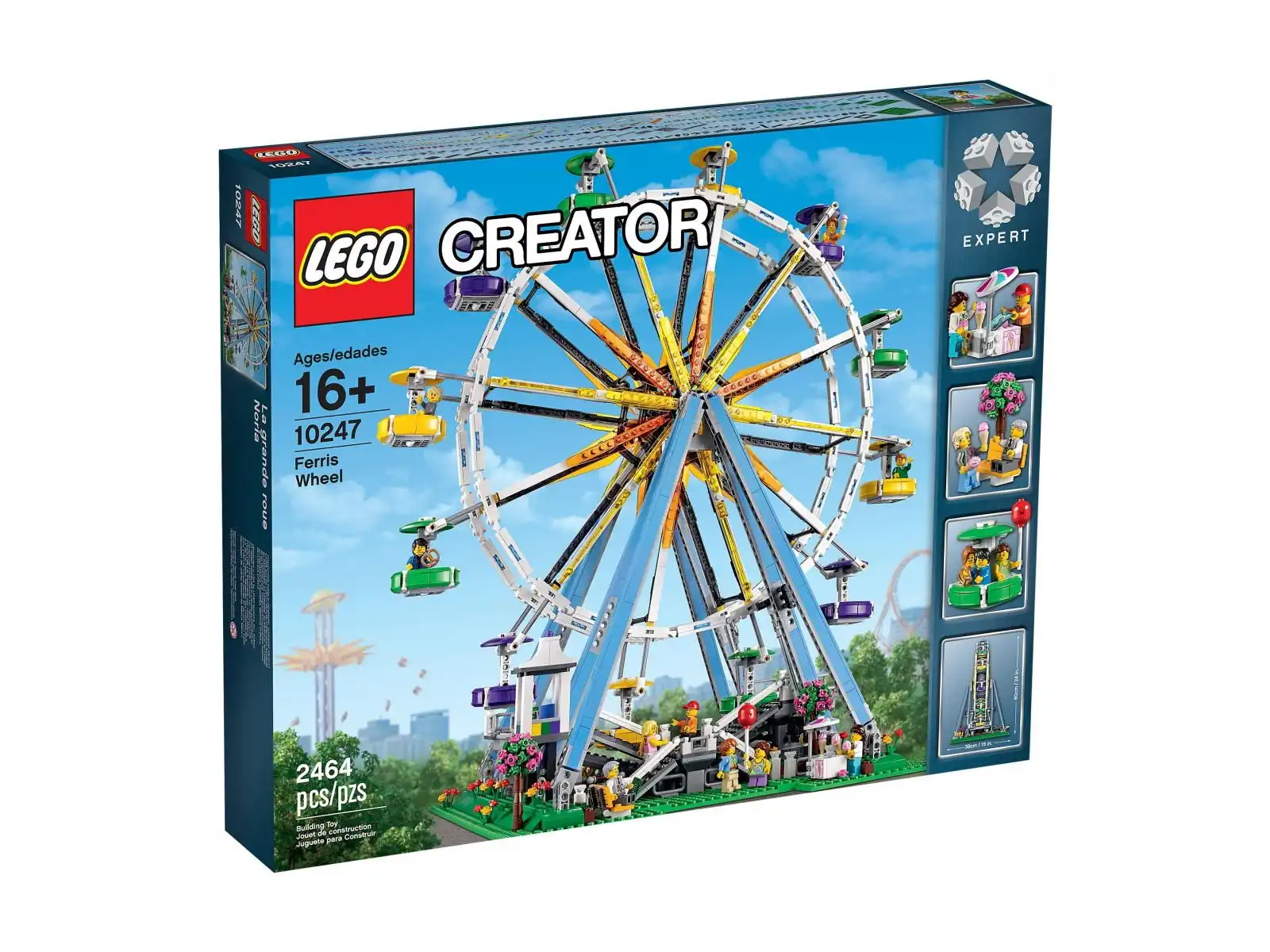 Zbuduj główną atrakcję lunaparku — majestatyczny diabelski młyn! Ten niesamowity model z serii LEGO® Creator Expert charakteryzuje się elegancją, która łączy w sobie nostalgię, romantyzm i przygodę. W mieście pojawił się lunapark. Sprzedawca lodów jest zajęty obsługiwaniem długiej kolejki podekscytowanych klientów czekających na pierwszą przejażdżkę w magicznym diabelskim młynie, który góruje nad okolicą. Powoli obracaj korbę i obserwuj, jak gondole diabelskiego młyna obniżają się majestatycznie, umożliwiając wejście pierwszych osób. Pociągnij dźwignię, aby podwyższyć platformę, otwórz drzwi gondoli i pomóż wsiąść pierwszym pasażerom! Budowanie tego eleganckiego modelu zapewni sporo zabawy, a jego urok i magia z pewnością pobudzą Twoją wyobraźnię. Diabelski młyn można napędzić za pomocą średniego silniczka z zestawu LEGO Power Functions 8883 oraz schowka na baterie AAA 88000 (dostępne osobno). W zestawie 10 minifigurek: operator karuzeli, sprzedawca lodów, 4 dzieci oraz 4 dorosłych.