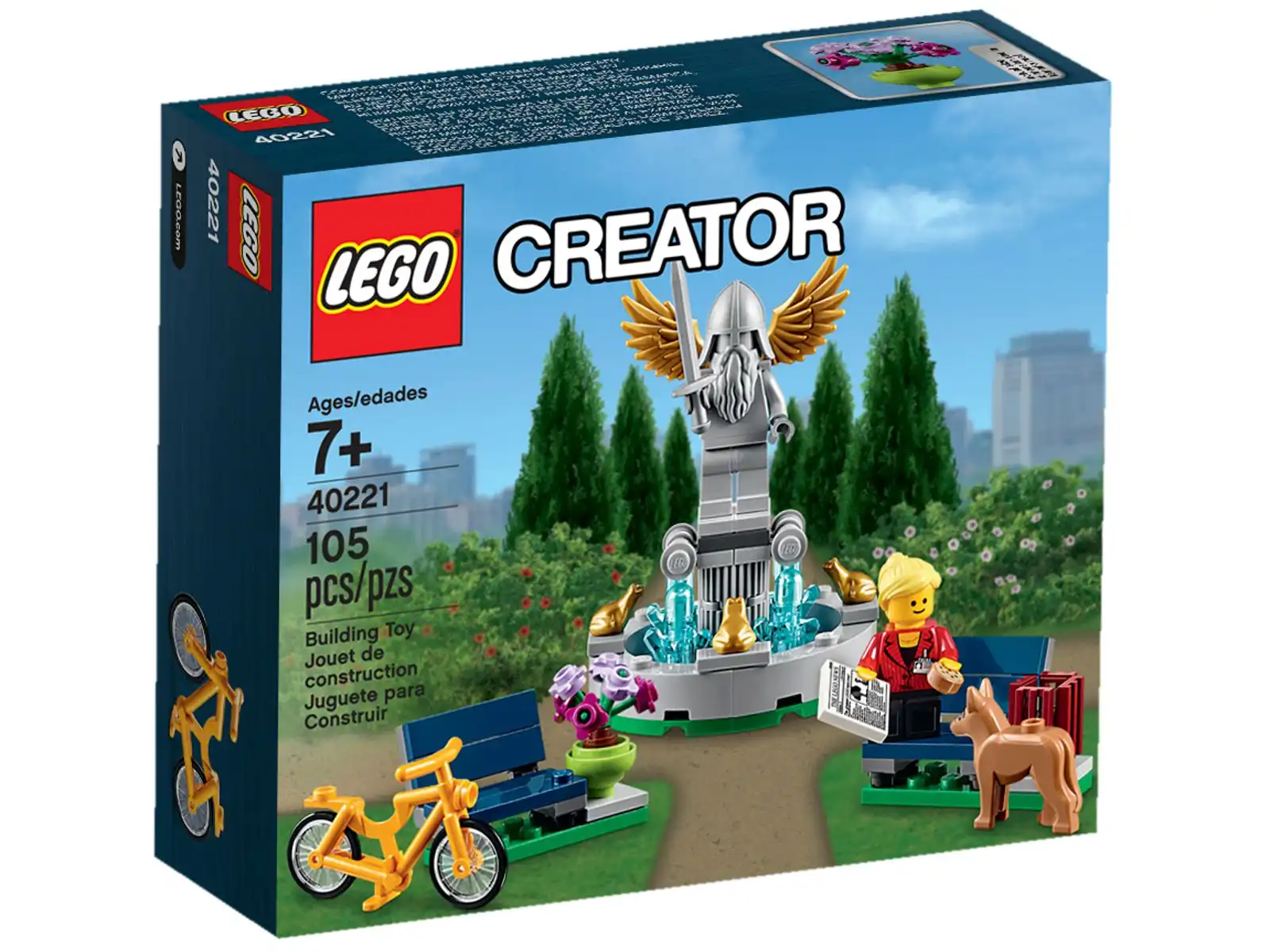 Zbuduj wspaniałą fontannę LEGO® z męskim lub żeńskim posągiem, który można zmieniać. Posąg ma złote skrzydła, a w zestawie znajdziesz poza tym przezroczyste elementy wody, 2 parkowe ławki, doniczkę i kosz na śmieci. Później zaparkuj rower i usiądź na ławce razem z kobietą, która przyszła z psem do parku poczytać gazetę i zjeść ciastko. Ten zestaw będzie doskonałym prezentem dla miłośników miejskich scenerii z zestawów LEGO Creator Expert. Zestaw zawiera minifigurkę i psa.