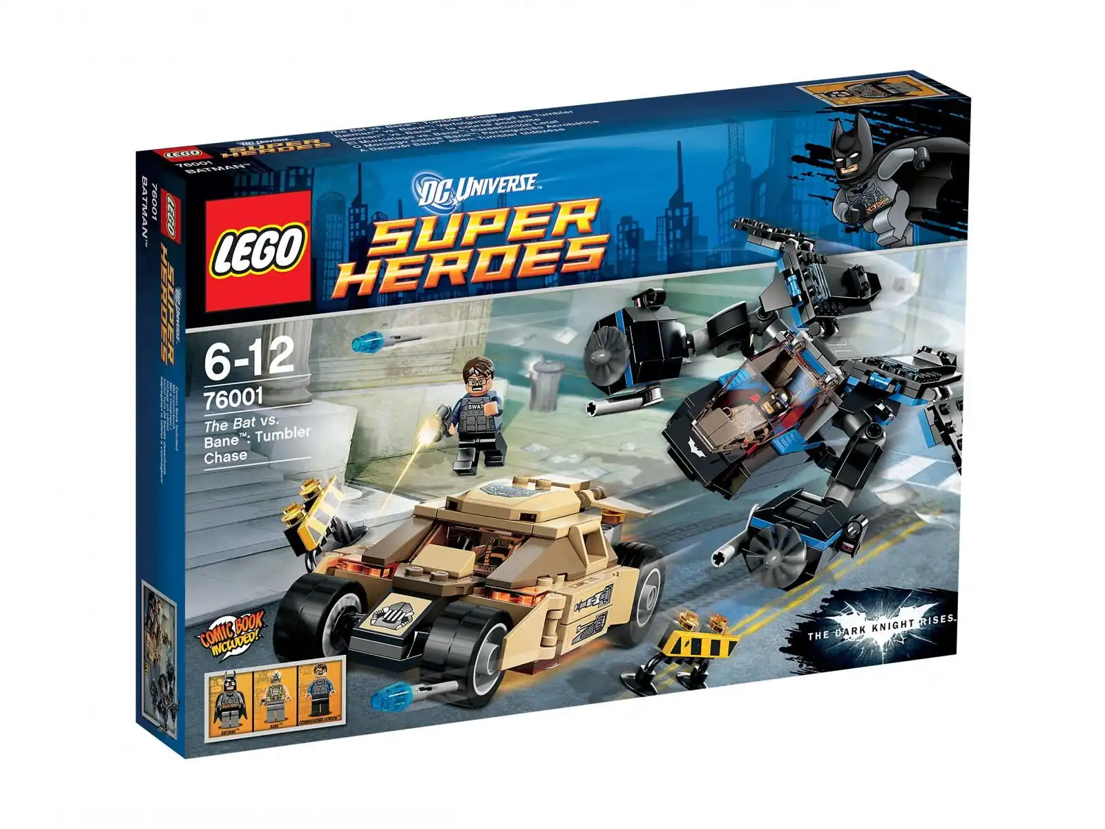 Wysoko ponad Gotham Batman zauważa Banea w opancerzonym tumblerze. ścigającego komisarza Gordona. Rozbij blokady drogowe w uzbrojonym w dwie ukryte wystrzeliwane rakiety tumblerze Banea. z którego rur wydechowych buchają płomienie. Potem obniż lot Nietoperza i uratuj komisarza. wciągając go liną ratunkową z kołowrotem zanim dopadnie go Bane! Zestaw zawiera 3 minifigurki: Batmana. Banea i komisarza Gordona z wyborem broni.