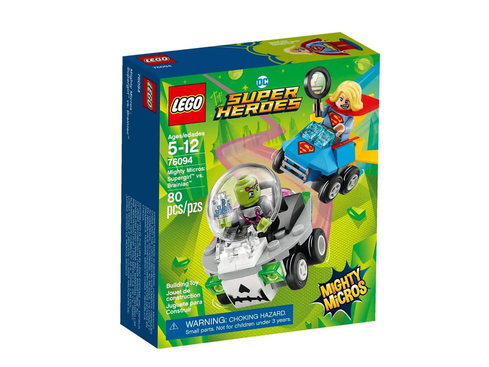 Ten zestaw LEGO® DC Comics Super Heroes Mighty Micros zawiera rakietę Supergirl i UFO Brainiaca, dwie minifigurki z krótkimi nogami oraz pomniejszone miasto i szkło powiększające do zabawy.