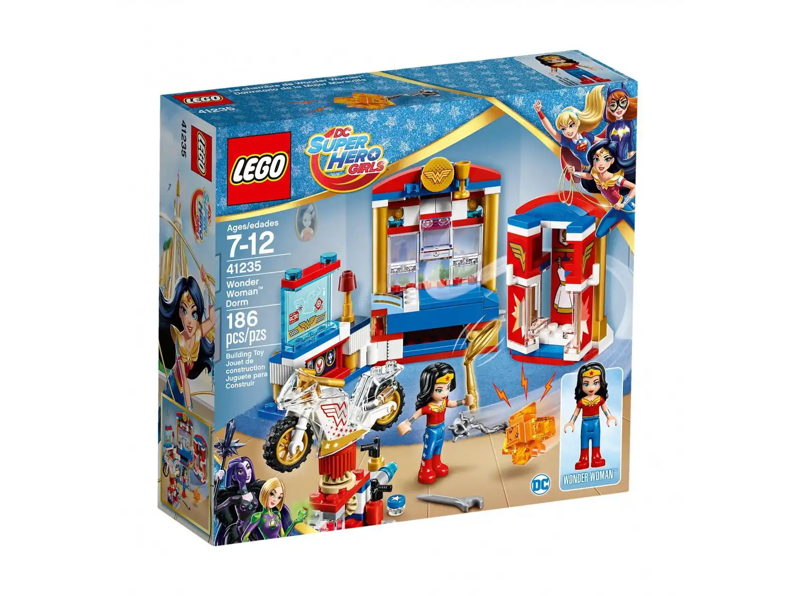 Wskocz do pełnego akcji świata LEGO® DC Super Hero Girls™! Wonder Woman™ próbuje właśnie uratować swoje Złote lasso przed Kryptomitą™. Ten niesamowity zestaw zawiera minilaleczkę Wonder Woman, sypialnię z otwieranym oknem, łóżkiem z tajną szufladą/ekranem, osobną otwieraną szafę i warsztat, a do tego „niewidzialny” motocykl, narzędzie/farbę i podejrzanego pomarańczowego Kryptomitę.