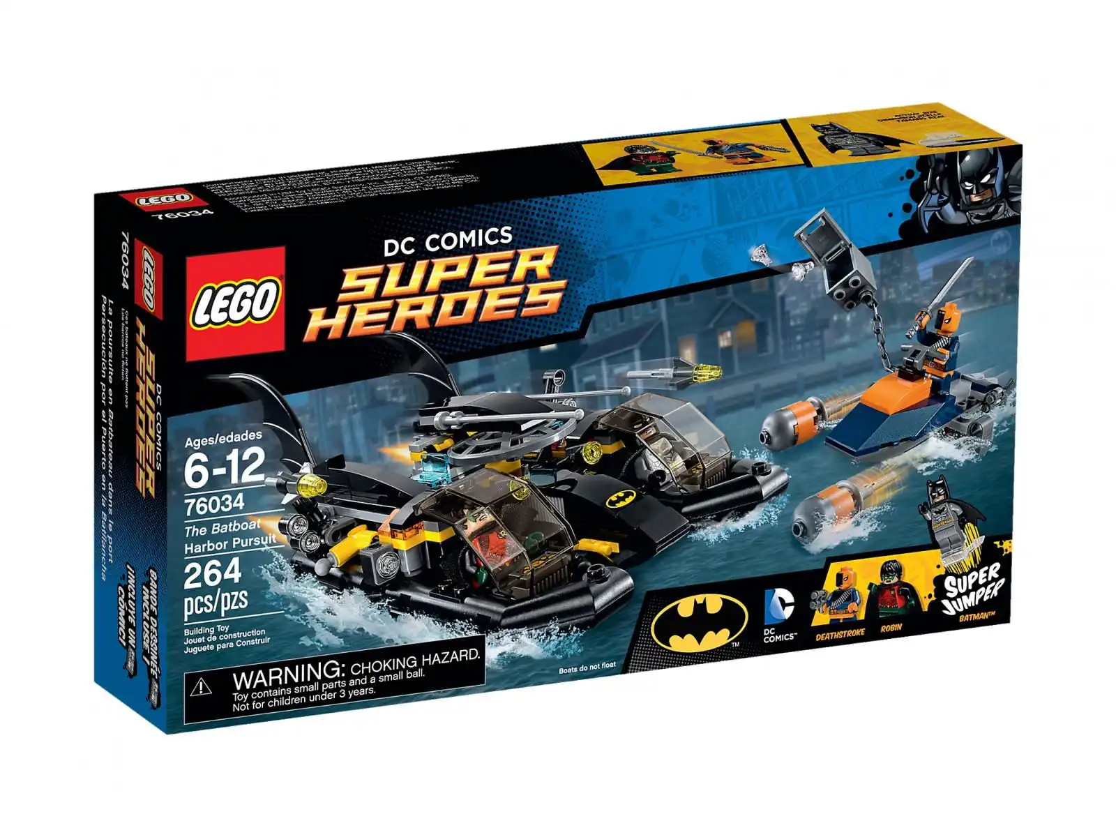 Deathstroke ukradł z banku diamenty i teraz ucieka na swoim opancerzonym skuterze wodnym. Umieść Batmana™ i Robina w kokpicie batłodzi i ruszaj w szalony pościg po zatoce Gotham City. Wysuń ukrytą wieżyczkę radarową i sprawdź na monitorze pozycję skutera. Unikaj rakiet wystrzeliwanych ze skutera oraz ataków Deathstroke'a próbującego za pomocą swojego Super Jumpera zniszczyć radar. Następnie uruchom mechanizm rozdzielenia pojazdu na dwa poduszkowce, zaskocz złoczyńcę i odzyskaj skradziony sejf z diamentami. W zestawie 3 minifigurki z dodatkami: Batman™, Deathstroke oraz Robin.