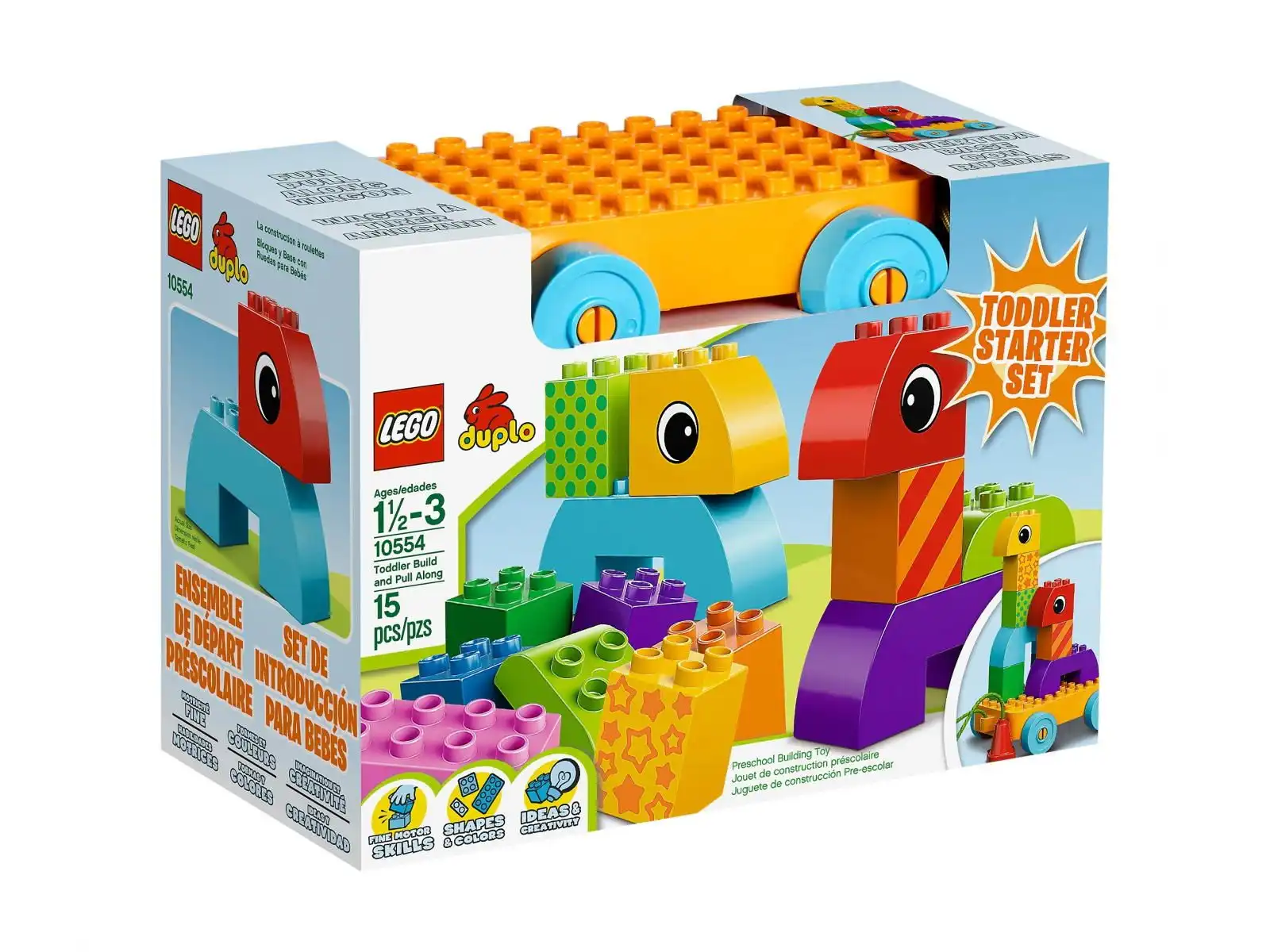 Lego Duplo Kreatywny pojazd 10554. Duże klocki LEGO DUPLO stanowią idealne wprowadzenie do kreatywnego budowania dla małych dzieci. Zestaw zawiera 15 klocków i innych elementów w jasnych kolorach, w tym pojazd do ciągnięcia. Wszystkich dużych klocków można używać łącznie ze standardowymi klockami i elementami DUPLO.
