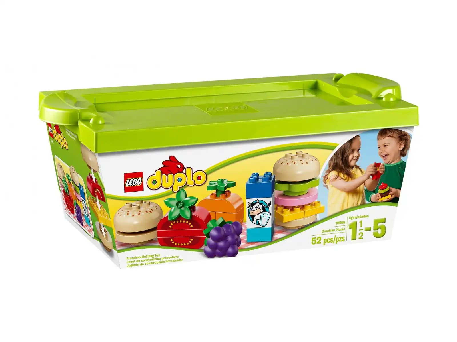 Dzięki kreatywnemu piknikowi LEGO® DUPLO® Twoje dziecko może stworzyć niezwykły zestaw przepysznych przekąsek! Łączenie kolorowego chleba, mięsa, keczupu, sałaty i różnych innych klocków w pyszne kanapki, burgery i przekąski będzie świetną zabawą! Podawać z porcją mleka DUPLO. Wieczko pudełka służy też za tackę. Do zestawu dołączono przepisy na kanapki, które pomogą Tobie i Twojemu dziecku zacząć zabawę.