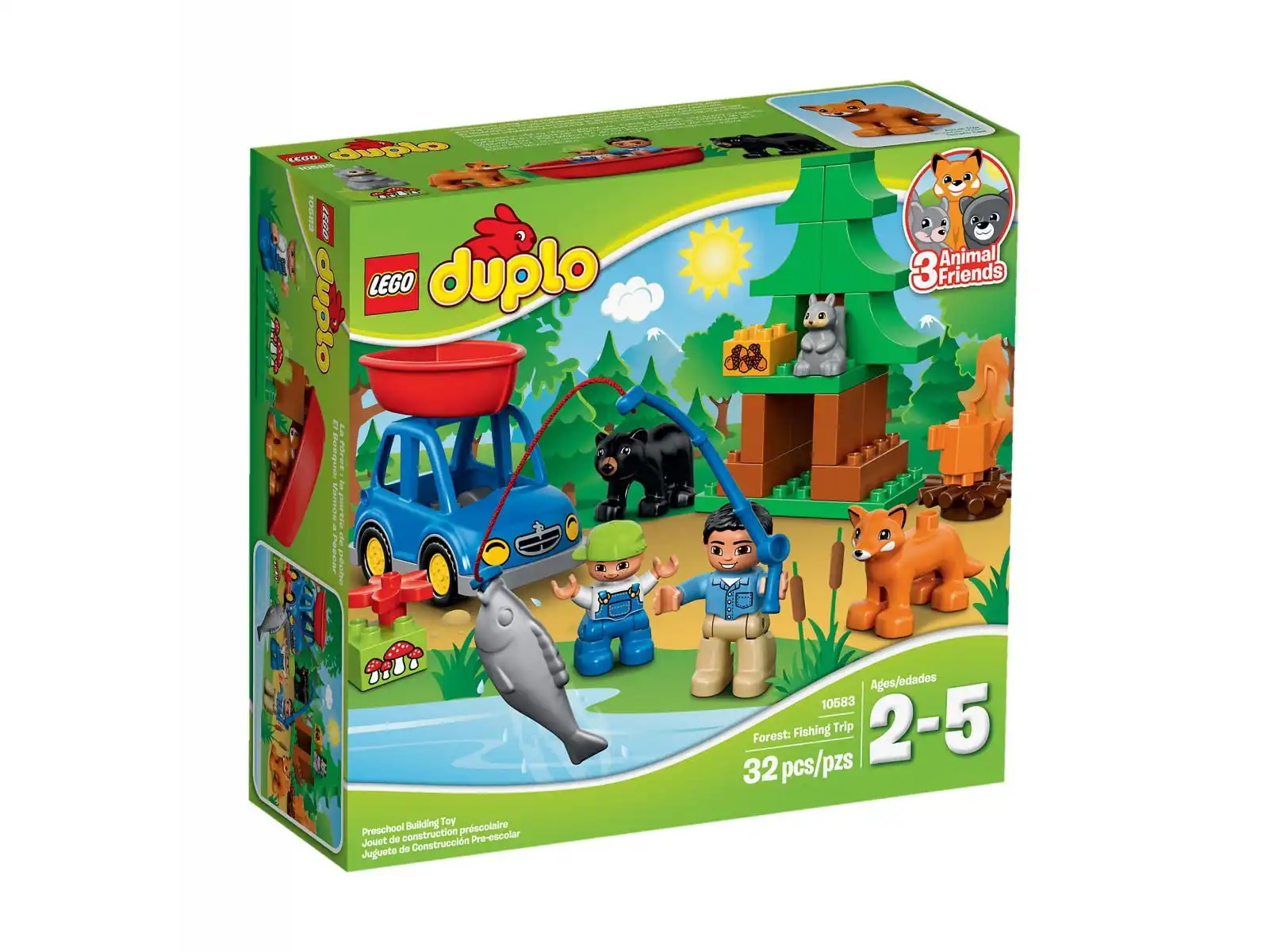 W zestawie 2 figurki LEGO® DUPLO® (tata i dziecko) oraz niedźwiadek, lis, wiewiórka i ryba.