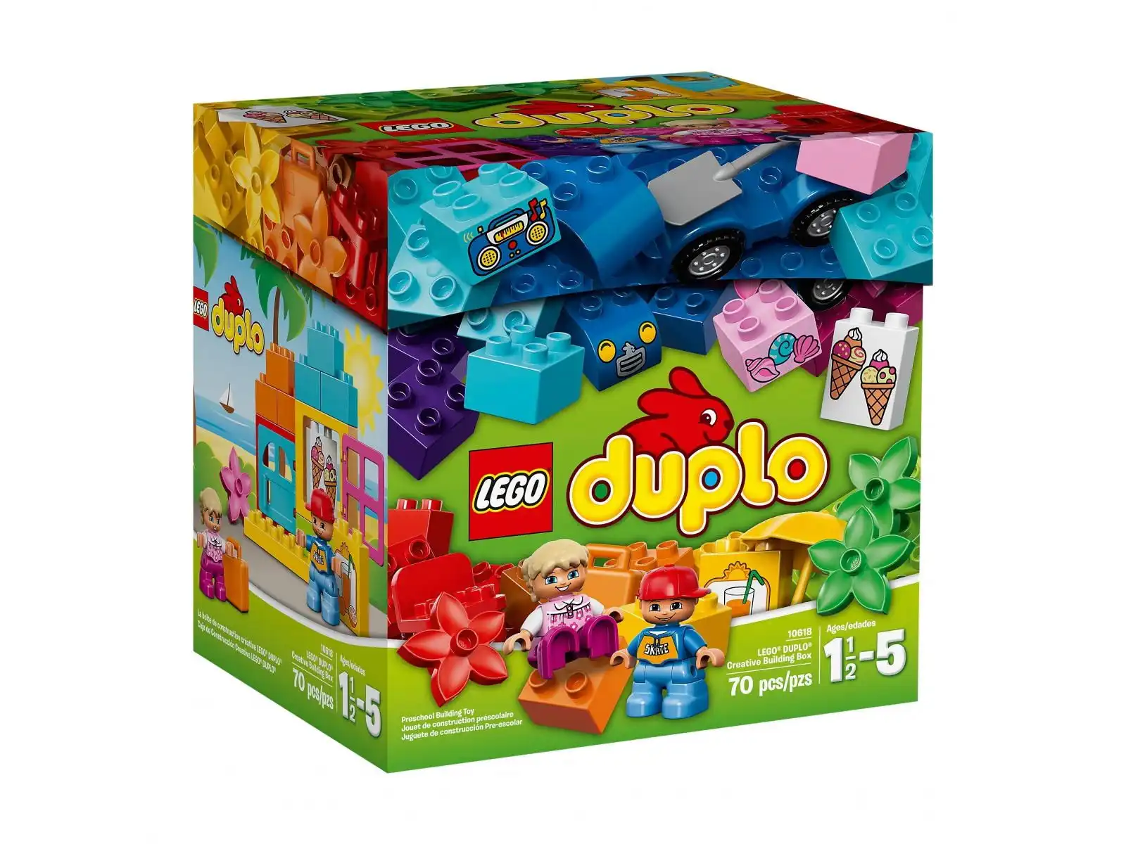 Zestaw kreatywnego budowniczego LEGO® DUPLO® — bogate źródło inspiracji! Co Twój maluch jest w stanie stworzyć za pomocą pudełka pełnego dużych klocków LEGO DUPLO? Opowiadaj ciekawe historie za pomocą klocków z dekoracjami związanymi z wakacjami, aby pobudzić wyobraźnię dziecka i zachęcić je do nieograniczonej kreatywności. W zestawie zawarto także klocki do zbudowania samochodu z oddzielną osią, otwierane drzwi i okno, a także akcesoria takie jak parasolka, teczka, krzesła i kwiaty. Kolorowe klocki LEGO DUPLO są opracowane tak, aby były bezpieczne i odpowiednie dla małych rączek. W zestawie 2 figurki dzieci LEGO DUPLO.