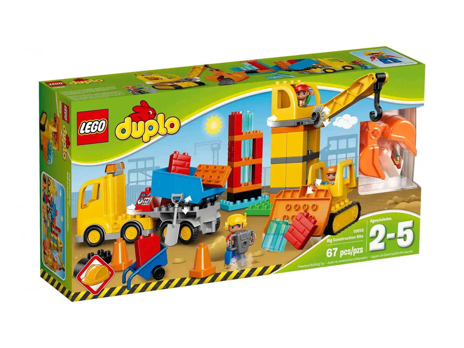 Mali budowniczowie od razu pokochają 3 modele maszyn do złożenia. Zanim wysypiesz nowe materiały z ciężarówki, oczyści plac budowy za pomocą buldożera na gąsienicach. Potem unieś klocki za pomocą dźwigu wyposażonego w ruchome ramię i chwytak i postaw budynek. Klocki LEGO® DUPLO® są specjalnie projektowane tak, by były bezpieczne dla małych rączek. W zestawie 3 figurki robotników budowlanych DUPLO, które zachęcą do wymyślania mnóstwa historii z podziałem na role.