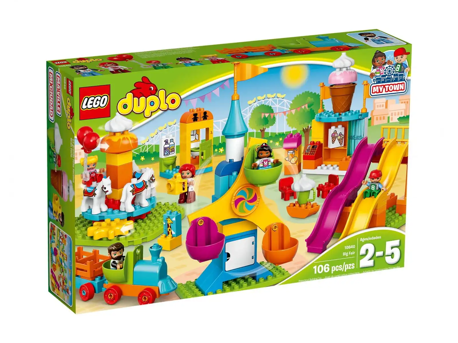 Odgrywaj scenki z weekendowej rodzinnej wycieczki do wesołego miasteczka za pomocą nowoczesnych figurek LEGO® DUPLO® i kolorowego, dużego lunaparku. Maluchy z zapałem zabiorą się za budowanie wesołego miasteczka: diabelskiego młyna, który można obracać i obserwować poruszające się kabiny, karuzeli z obracającym się kołem zębatym i czterema konikami oraz wysokich, pofalowanych zjeżdżalni. Mogą również poprowadzić mały pociąg i odwiedzić stragan z lodami albo odczepić dużego loda z dachu i dać gomamie lub tacie. W zestawie pięć figurek DUPLO.
