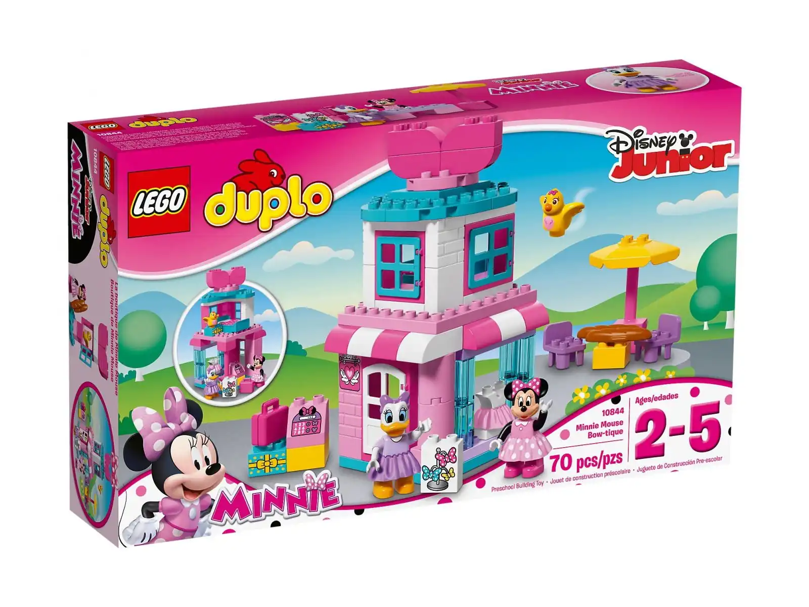 - Zestaw zawiera klocki z rysunkami kasy, prezentu i kokard do włosów, a także szyld butiku Minnnie.