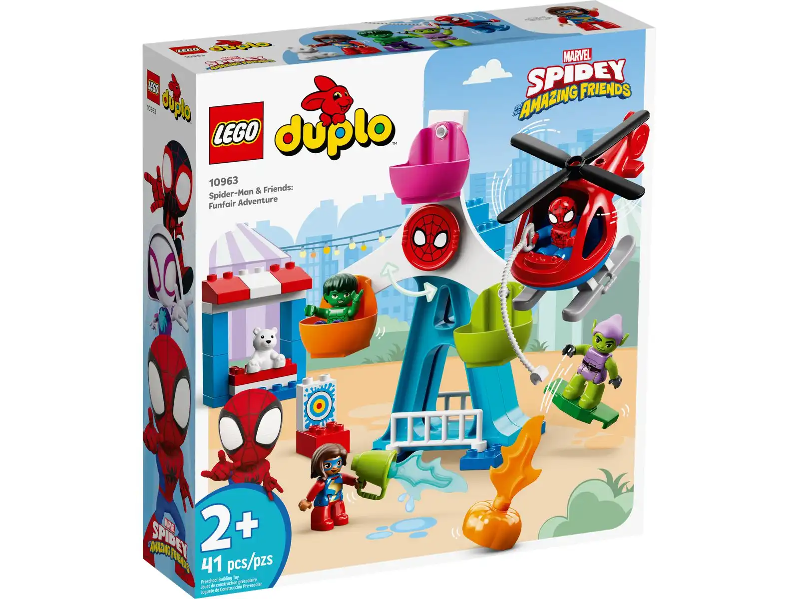 Ten wspierający rozwój zestaw do zbudowania i zabawy stanowi doskonałe wprowadzenie do świata superbohaterów Marvela. Młodzi fani emitowanego na platformie Disney+ serialu „Spidey and His Amazing Friends” znajdą tu cztery figurki DUPLO znanych postaci: Spider-Mana, Hulka, Pannę Marvel i Zielonego Goblina. Razem z nimi dzieci mogą przejechać się diabelskim młynem, wystrzelić płonące dyniowe bomby, pobawić się armatką wodną i przelecieć się helikopterem wyposażonym w obrotowy wirnik. Zabawa w odgrywanie kreatywnych przygód z superbohaterami pozwoli dzieciom rozwinąć ważne umiejętności.