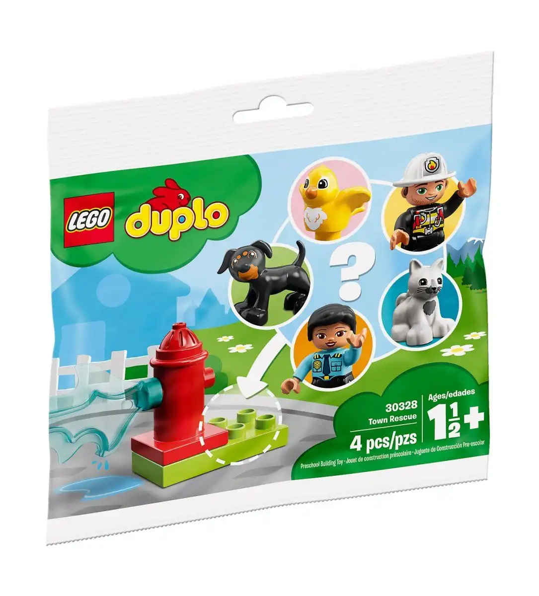 4, w tym trzy klocki budowlane + jedna z 3 dostępnych figurek: kurczaczek, policjantka, kotek