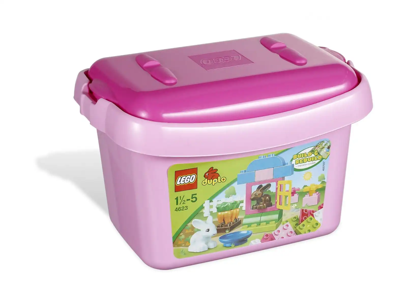Ten uroczy zestaw zawiera króliki, marchewki, kwiaty oraz podstawowe klocki LEGO DUPLO w kolorze różowym i klasycznych kolorach DUPLO. Dodatkowo zestaw zawiera broszurę z inspirującymi pomysłami, a całość znajduje się w solidnym pudełku do przechowywania klocków LEGO.