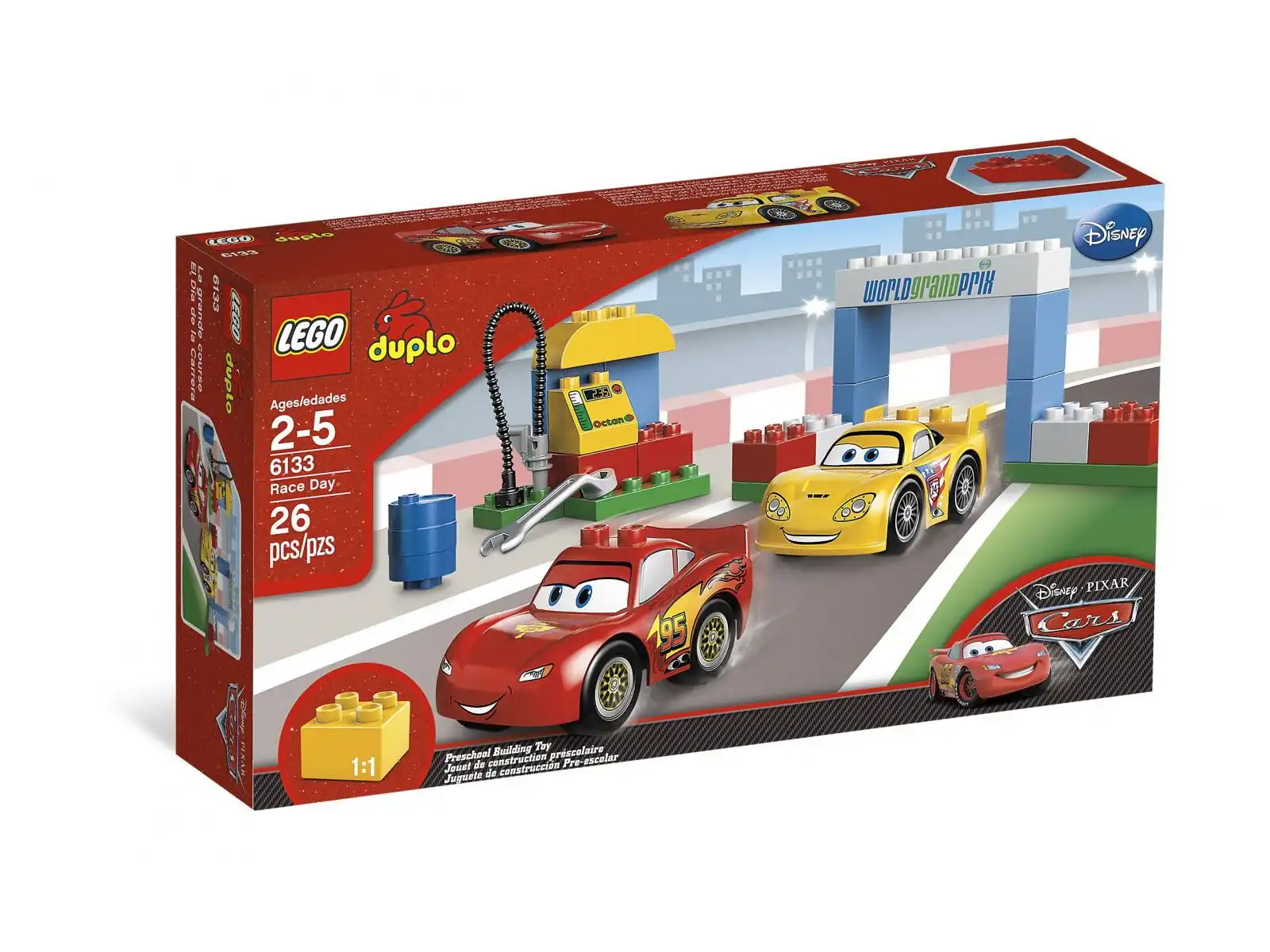 Zestaw obejmuje klasyczny samolot z obrotowym śmigłem, mały budynek lotniska z wieżą kontroli lotów, stanowisko do tankowania oraz stolik z przekąskami i stołkami.