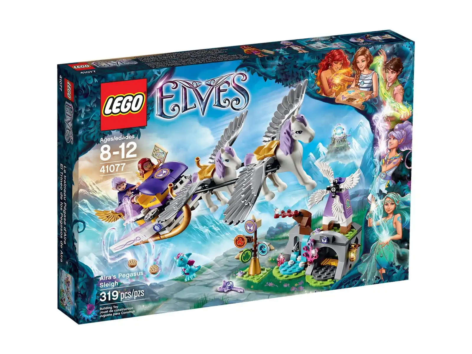 Zbuduj latające sanie dla elfki wiatru, Airy Whisperwind. Wznieś się wysoko w niebo na saniach ciągniętych przez 2 pegazy, Promyczka i Rufusa, aby pomóc elfom LEGO® znaleźć magiczny klucz wiatru, dzięki któremu będą mogły odesłać swoją zaginioną przyjaciółkę, Emily Jones, z powrotem do świata ludzi. Przygotuj na drogę skrzynię z ciasteczkami, a potem razem z Airą i elfką ognia o imieniu Azari Firedancer podążaj za magiczną mapą, aby znaleźć na niebie starożytny wiatrak. Wiadomo, że smocze dziecko, Miku, ma ostatni klucz, ale czy elfom uda się go odzyskać? Pomóż Airze wykorzystać magiczny podmuch wiatru, by rzucić w stronę Miku ciasteczka i w ten sposób odciągnąć uwagę młodej smoczycy od pilnowanego przez nią klucza. W zestawie minilaleczki Aira Whisperwind i Azari Firedancer oraz smocze dziecko Miku i 2 pegazy: Promyczek i Rufus.
