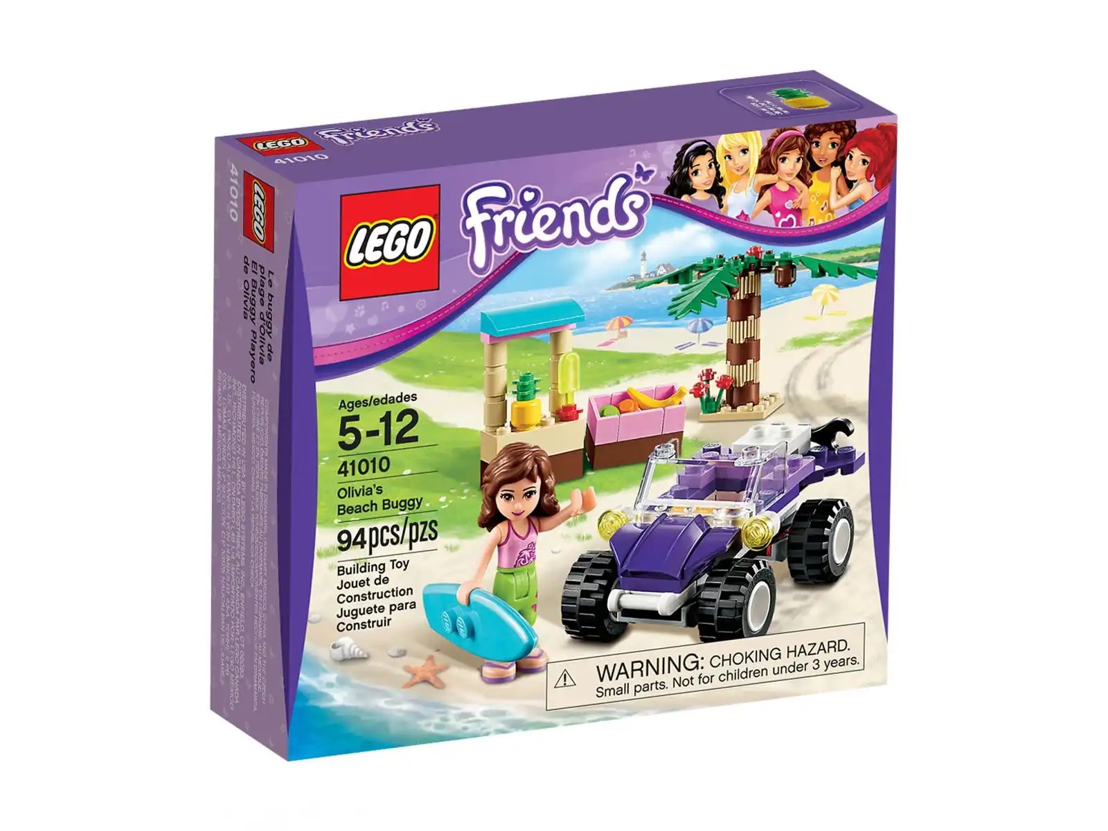 W zestawie klocków LEGO znajdziemy: figurkę Olivi, fioletowy łazik plażowy (z gumowymi oponami), deskę surfingową, drzewo kokosowe, elementy plaży, budkę z lodami i owocami.