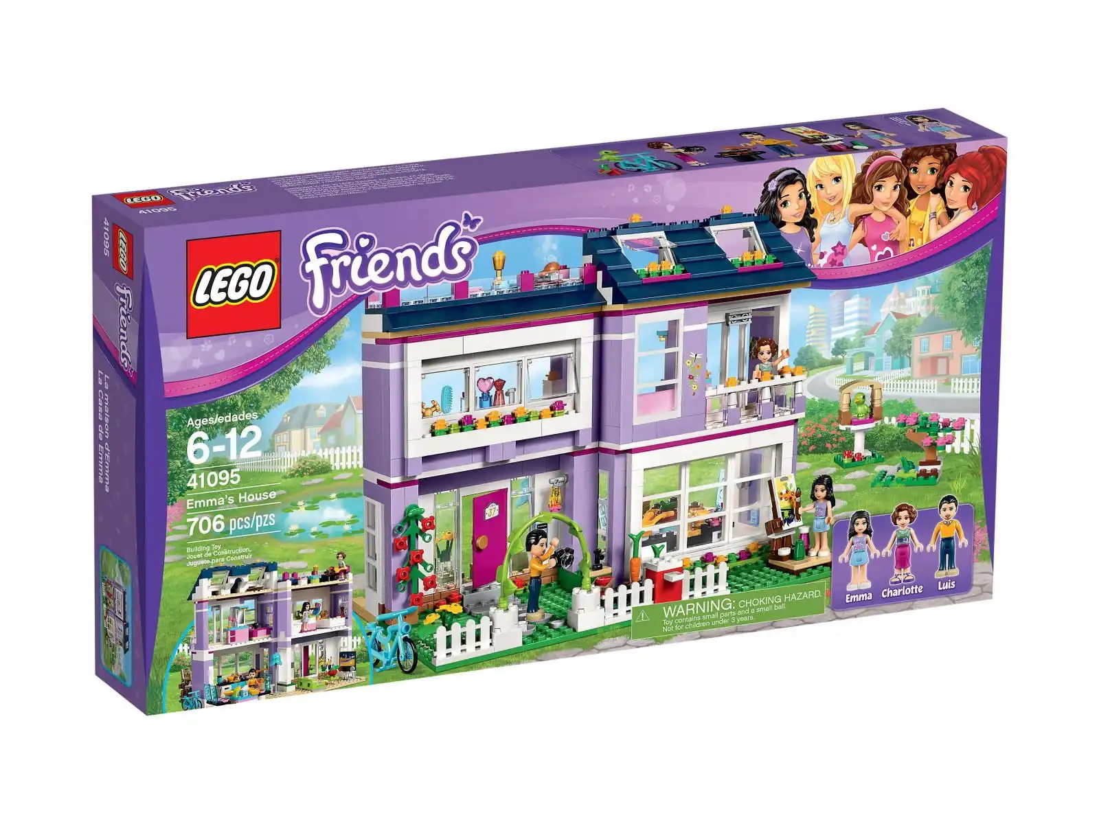 Zestaw Dom Emmy 41095 zawiera modułowy dom z kuchnią, salonem, łazienką, sypialnią, pokojem na poddaszu, tarasem na dachu, balkonem, ogrodem i rowerem. Moduły pomieszczeń można zmieniać miejscami i kreować nowy wygląd domu. W kuchni znajdziemy otwieraną lodówkę i zmywarkę do naczyń, zlew, szufladę, płytę kuchenną, stół z 3 krzesłami oraz lampę. W sypialnia natomiast łóżko, toaletkę z lustrem i rozsuwane drzwi balkonowe. Łazienka składa się z wanny, toalety i zlewu. Na tarasie który jest na dachu ulokowany został grill, stół i stołek. Na ogród składa się poletko z warzywami, ogród zen, działającą skrzynkę pocztową i obrotowy ptasi domek.