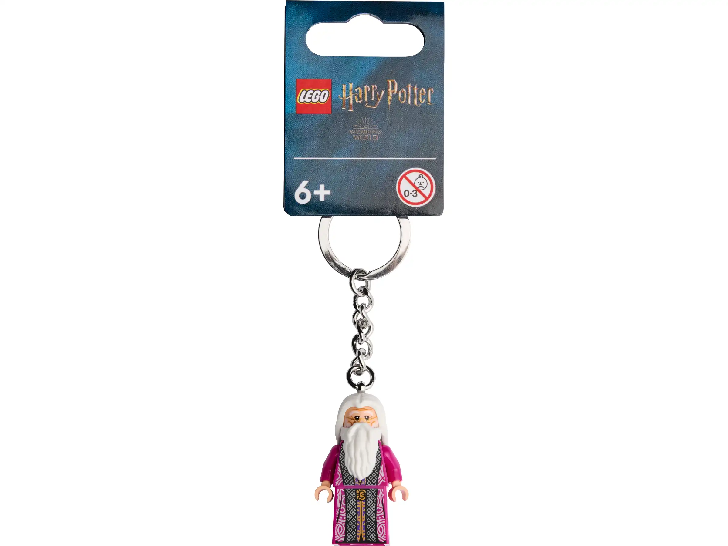 - Breloczek z minifigurką LEGO® — minifigurka Dumbledore’a™ z ruchomą głową, ramionami i dłońmi przyczepiona jest do wytrzymałego metalowego łańcuszka z kółkiem na klucze. Minifigurki nie można odczepić od łańcuszka