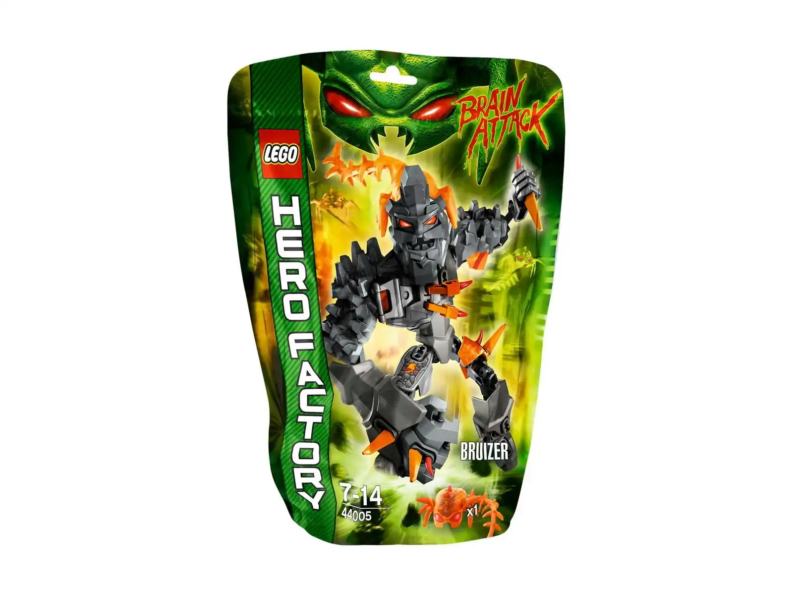 Lego Hero Factory Bruizer 44005. Trzeba ostrzec bohaterów z LEGO® Hero Factory! Obce mózgi atakują galaktykę! Przekształciły skalnego giganta w bestię o rozszalałych oczach — BRUIZERA! Ten potwór z kamienną twarzą, pięścią wielką jak głaz, skalnymi naramiennikami i ostrymi kolcami to prawdziwe wyzwanie!