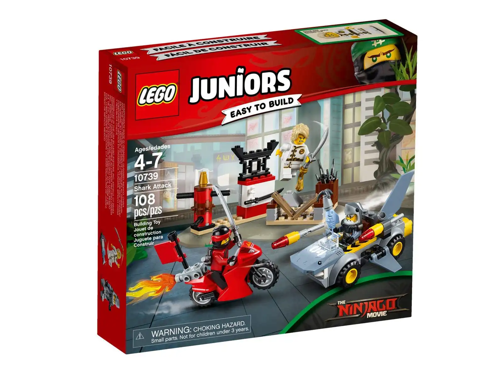 Dołącz do Kaia i Lloyda w walce przeciwko Żarłaczowi. Zestaw zawiera salę ćwiczeń ze stojakiem na broń, blokami do rozbijania i obracającym się manekinem treningowym, ognisty motocykl oraz samochód-rekina z wystrzeliwanymi rakietami. Ten rewelacyjny zestaw z filmu LEGO® NINJAGO®: FILM™ zawiera proste instrukcje budowania i zabawy oraz duże klocki, które pomogą młodszym dzieciom nabrać pewności siebie. Zestawy LEGO Juniors są odpowiednie dla dzieci w wieku 4–7 lat. W zestawie są trzy minifigurki.