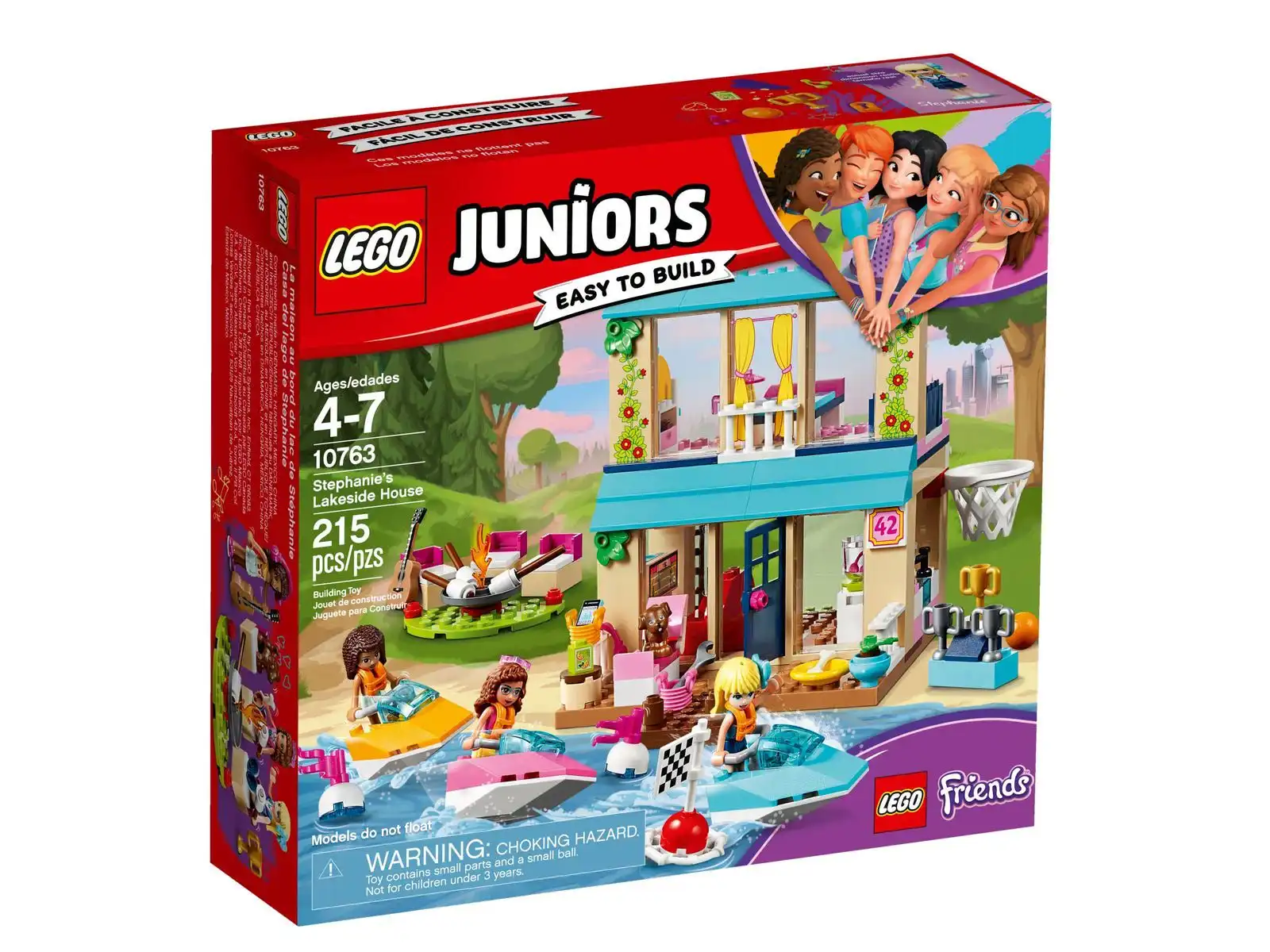 Przeżyj ciekawe przygody z zestawem LEGO® Juniors 10763 Domek nad jeziorem Stephanie! W zestawie znajdziesz łatwy do zbudowania, modułowy domek piętrowy, który zawiera podstawkę i ścianę startową. W domku jest kuchnia, salon i sypialnia, a na zewnątrz znajduje się kosz do koszykówki, trzy skutery wodne i ognisko otoczone siedzeniami. Ten sportowy zestaw LEGO Juniors zawiera proste instrukcje budowania i zabawy, które pomagają poczuć się pewniej dzieciom w wieku od 4 lat. W zestawie trzy minilaleczki i figurka psa.