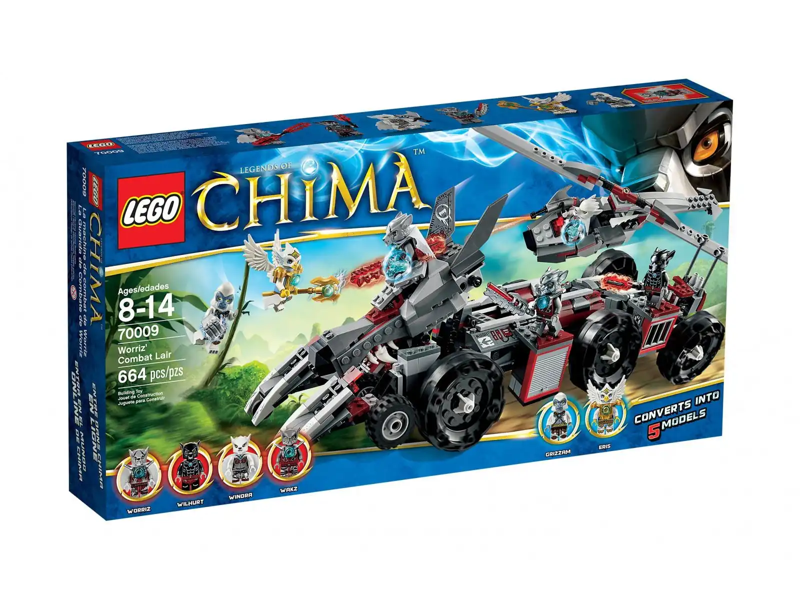 Ruszaj do walki w pojeździe bojowym Worriza. Ścigaj Grizzama i Eris w wilczym bojowym wynalazku z 6 ogromnymi kołami i 5 odczepianymi pojazdami. Odpal helikopter z ruchomym wirnikiem, by powstrzymać powietrzny atak Eris. Potem wypuść wilczy motocykl i 2 wilcze śmigacze, żeby zmierzyć się w dżungli z Grizzamem. Gdy już schwytasz przeciwników, zamknij ich w więziennej ciężarówce na ciężkich oponach i odwieź do celi! Bojowy pojazd Worriza to najpotężniejszy wóz bojowy.