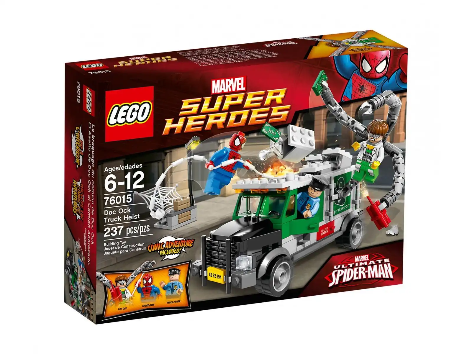 Doctor Octopus™ potrzebuje pieniędzy, diamentów i złota, by sfinansować swoje podłe plany… więc postanowił zdobyć trochę gotówki jak każdy bandyta! Jego ruchomymi ramionami możesz zerwać dach furgonetki z pieniędzmi, a gdy kierowca będzie uciekać w bezpieczne miejsce, wysadź tylne drzwi dynamitem i tajnym przyciskiem. Ale co to? Spider-Man™ zauważył Octopusa™ i rusza uratować sytuację! Czy zdoła go schwytać w supermocne sieci? Zestaw zawiera 3 minifigurki: Spider-Mana™, Doctora Octopusa™ i kierowcę ciężarówki.