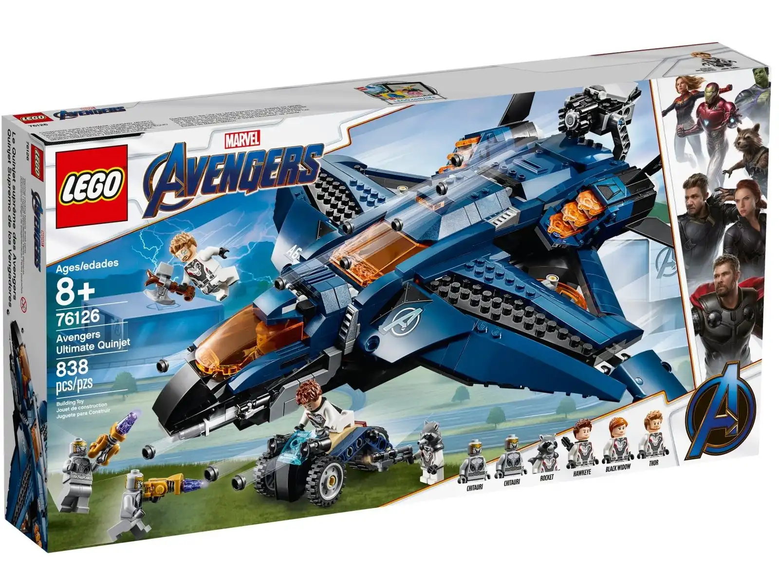 - W tym zestawie z superbohaterami znajduje się sześć minifigurek ze świata Marvela (nowości na marzec 2019 r.): Czarna Wdowa, Hawkeye, Rocket, Thor i dwóch Chitauri.