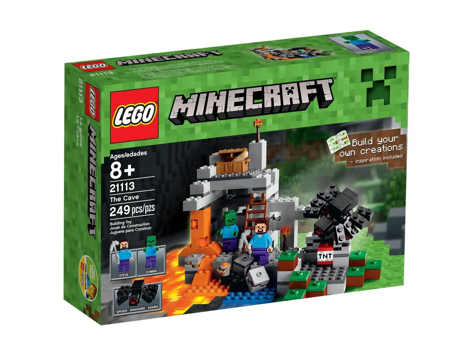 Udaj się na niebezpieczną wyprawę do jaskini w celu zdobycia niezbędnych zasobów. Wykorzystaj żelazny kilof do kopania i obrony przeciwko groźnym zombie i pajęczym mobom. Wydobądź cenną rudę i minerały przy pomocy dynamitu oraz połącz płynącą wodę z lawą w celu stworzenia drogocennego obsydianu. Kiedy skończysz kopać i walczyć, spróbuj odzyskać energię dzięki skrzyni z chlebem. Zachowaj ostrożność! Zestaw można przebudowywać na inne konstrukcje LEGO® Minecraft™! W zestawie 2 minifigurki z akcesoriami: Steve oraz zombie, a także pająk.