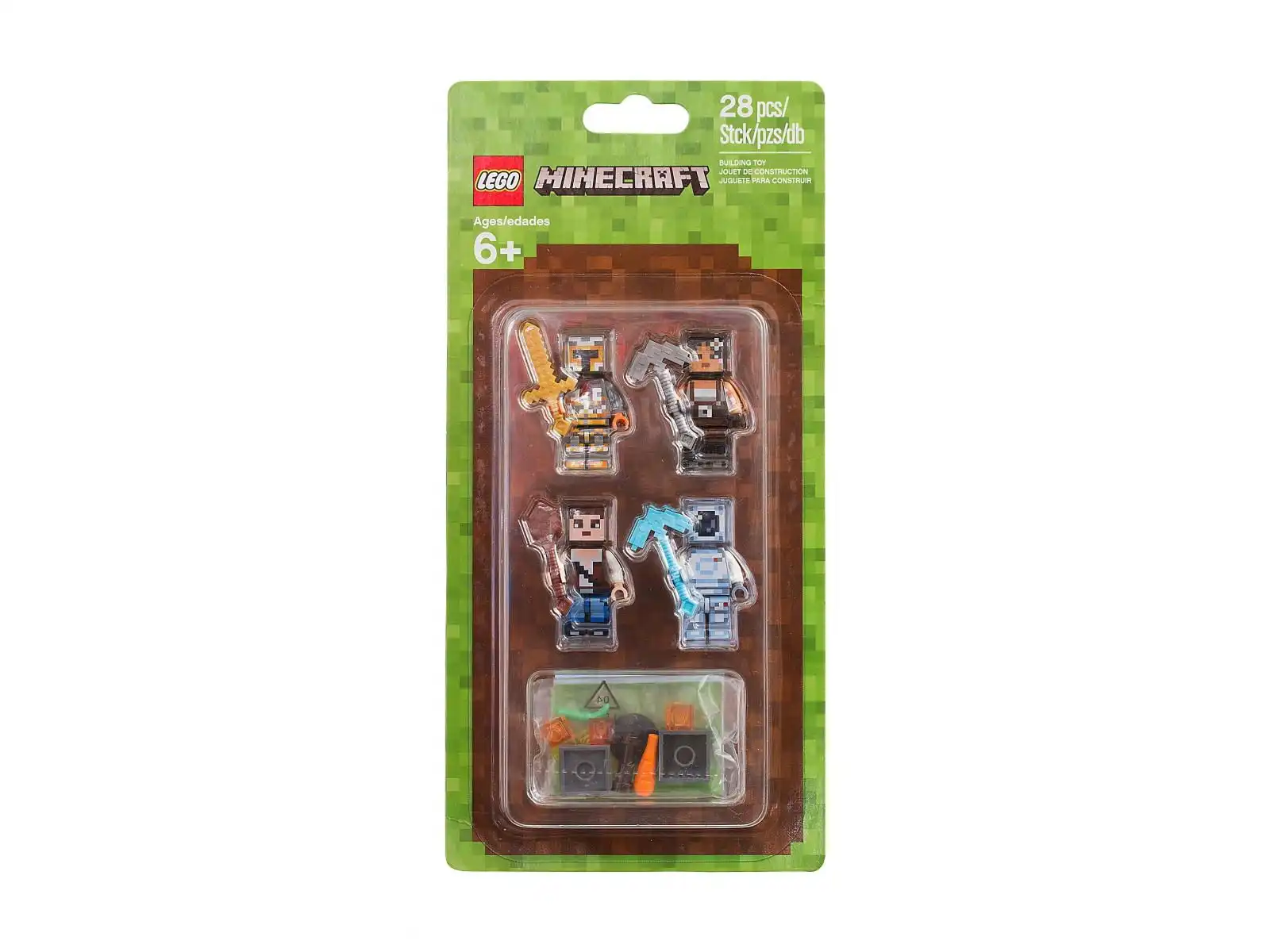 - W zestawie 4 minifigurki, z których każda ma własny styl oparty na motywie Minecraft, oraz wybór elementów przedstawiających broń i narzędzia.