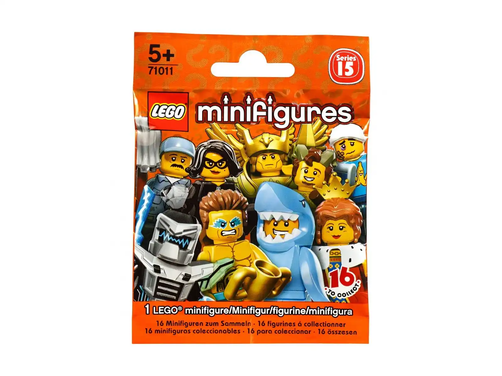 15. seria kolekcjonerskich zestawów LEGO Minifigures daje nowe możliwości zabawy posiadanymi klockami LEGO®. Można w nich znaleźć minifigurki Królowej, funkcjonariusza do spraw zwierząt, złodzieja klejnotów, kobiety w stroju plemiennym, baletnicy, latającego wojownika, fauna, przerażającego rycerza, mistrza zapasów, człowieka w stroju rekina, niezdary, wojownika kendo, kosmonauty, laserowego mecha, woźnego i rolnika. Każda minifigurka znajduje się w zapieczętowanym woreczku o nieznanej zawartości, w którym dodatkowo znajdziesz jedno lub więcej akcesoriów.