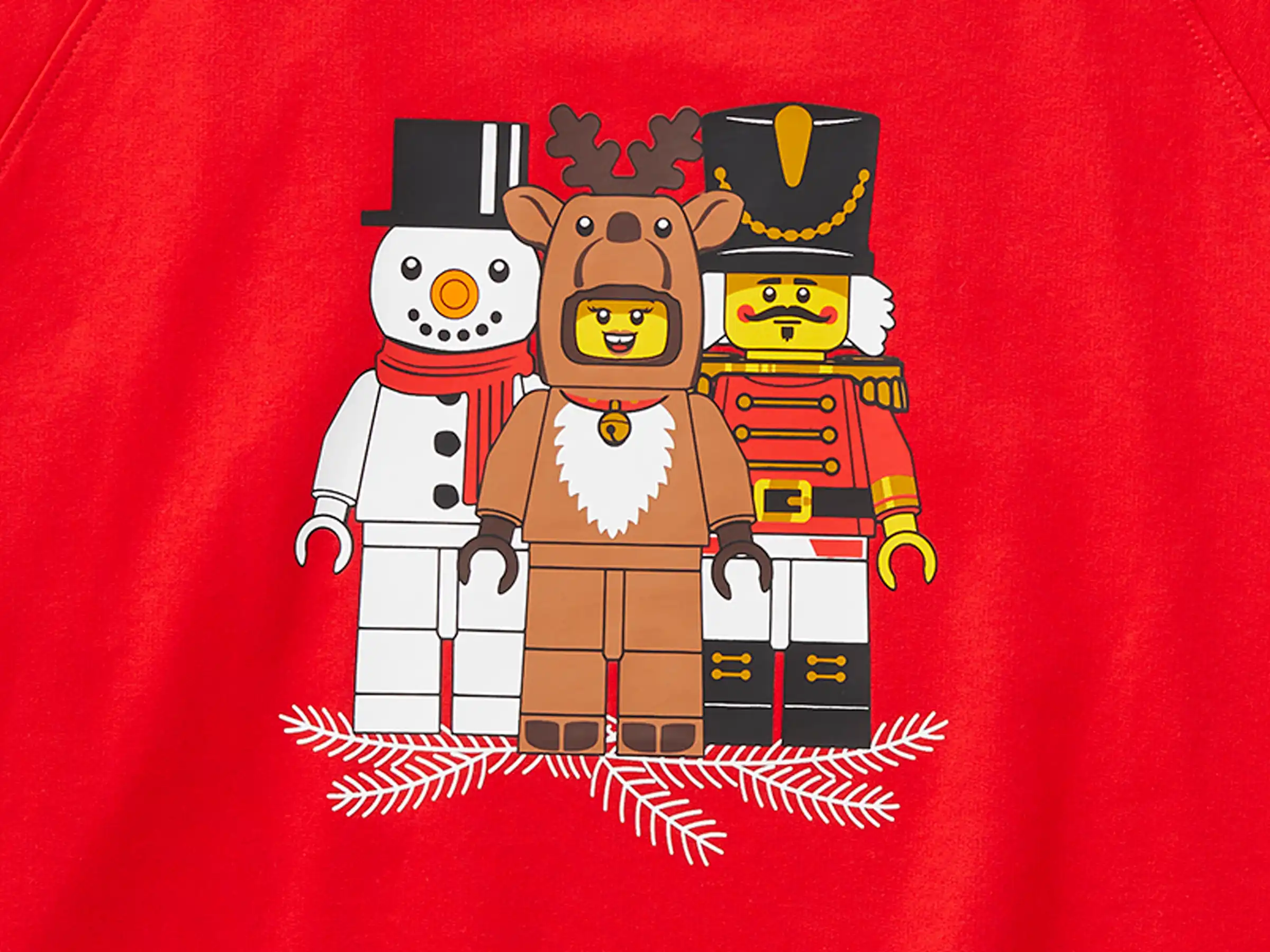 - Świąteczna bluza LEGO® – czerwona świąteczna bluza ma nadruk z trzema minifigurkami LEGO: bałwanem, reniferem i dziadkiem do orzechów