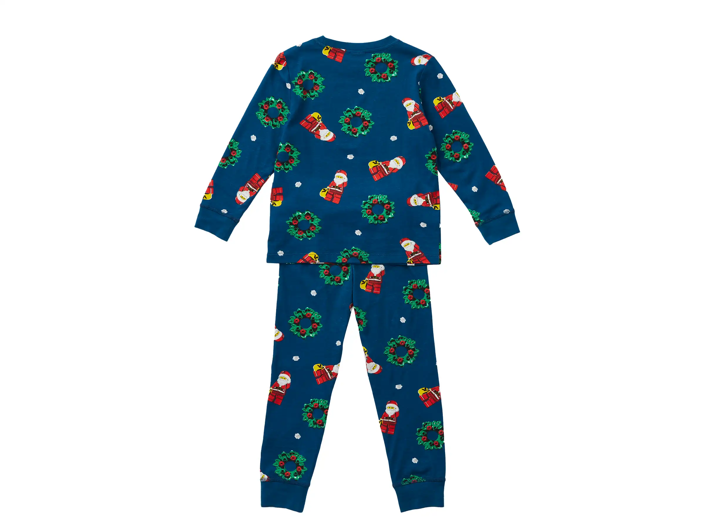 - Świąteczna piżama dla dzieci – LEGO® Piżama – granatowa ozdobiona grafikami ze Świętym Mikołajem i wieńcami to gwarancja słodkich snów