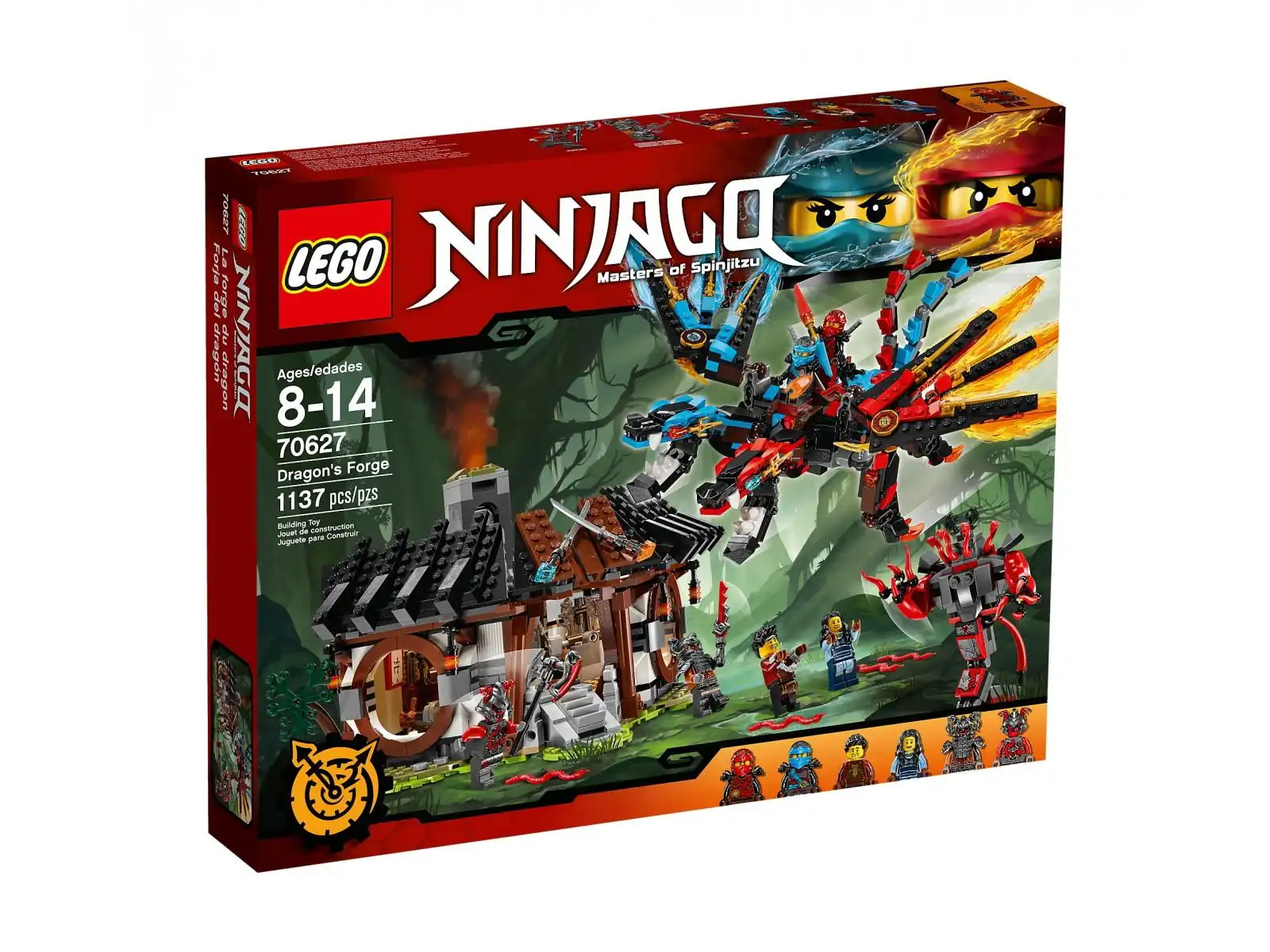 Kai i Nya nadlatują na grzbiecie Smoka Fuzji, by uratować rodziców z łap sił Cynobru. Pomóż im dostać się do Kuźni Smoka, a potem odzyskaj Ostrze Cofania Czasu! W Kuźni Smoka znajdziesz mnóstwo funkcji zachęcających do rozpoczęcia zabawy w odgrywanie ról — ukryty smoczy sztylet włączający funkcję obrotu komina, młot kowalski i miejsce do wypoczynku. Dwugłosy Smok Fuzji daje się ustawić w rozmaitych pozycjach i ma dwa miejsca dla minifigurek. Jego uzbrojeniem jest kusza, która pozwoli Ci pokonać mecha Buffmillion (wcześniej musisz go złożyć). W zestawie jest też sześć minifigurek z bronią, dzięki której zabawa w odgrywanie bitew będzie jeszcze bardziej dynamiczna.