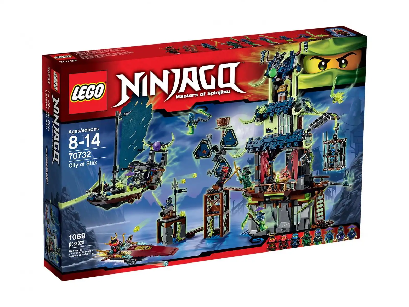 Dołącz do dzielnych ninja próbujących wedrzeć się do nawiedzonego miasta Stiix! Pędź w kierunku miasta na motorówce Nyi, jednocześnie ostrzeliwując upiornych nieprzyjaciół. Unikaj ostrzału z armaty w przyczółku, miotaczy klocków na potężnym statku duchów oraz miotacza bomb duchów umieszczonego na dachu budynku. Za wszelką cenę postaraj się dostać do doków. Dobądź potężnej głębostonitowej katany Jay'a i zmierz się z mistrzem kos Ghoultarem. Jeśli jakiś ninja zostanie uwięziony w klatce, uwolnij go za pomocą łomu Nyi. Znajdź i otwórz tajne wejście do świątyni, ale uważaj na zapadnię na parterze. Gdy dotrzesz na najwyższe poziomy miasta, zmierz się ze Złym Zielonym Ninja i zdobądź zwój Airjitzu! W zestawie 8 minifigurek z bronią i dodatkami: Kai, Jay, Nya, Zły Zielony Ninja, mistrz łańcuchów Wrayth, mistrz kos Ghoultar, wojownik-duch Cyrus i ninja-duch Ming.
