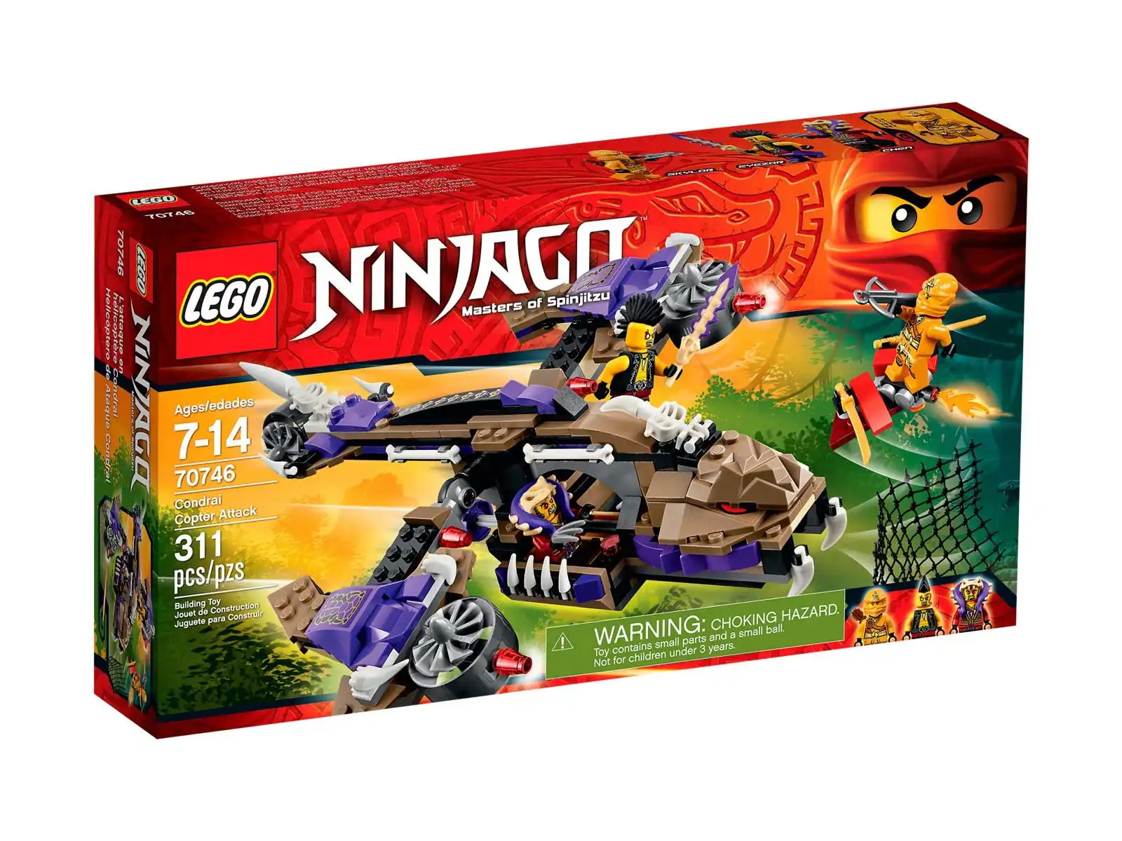Zły Chen i Eyezor ścigają Skylor przez dżunglę śmigłowcem Condrai. Pomóż Skylor uciec na jej rakietowej desce. Musisz przy tym uważać, aby nie trafił jej żaden z pocisków śmigłowca Condrai i żeby nie zaplątała się w siatkę, która wylatuje z paszczy węża! Widok pojazdu czarnych charakterów, który przestawia skrzydła w tryb bojowy, przyprawi cię o dreszcze. Zobacz, jak wyskakują z podwójnej kabiny i zwisają, trzymając się bocznych poręczy! Uciekaj, zanim uda im się dotrzeć do ziemi i pojmać Skylor! W zestawie 3 minifigurki z wyborem broni: Skylor, Chen i Eyezor.